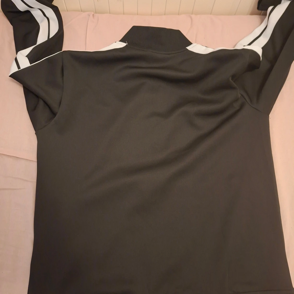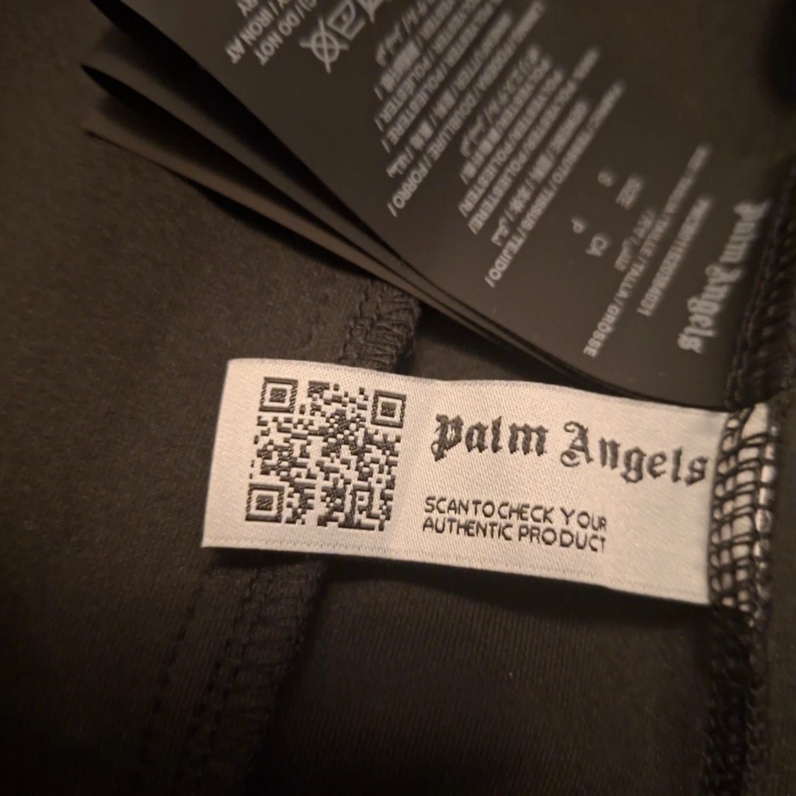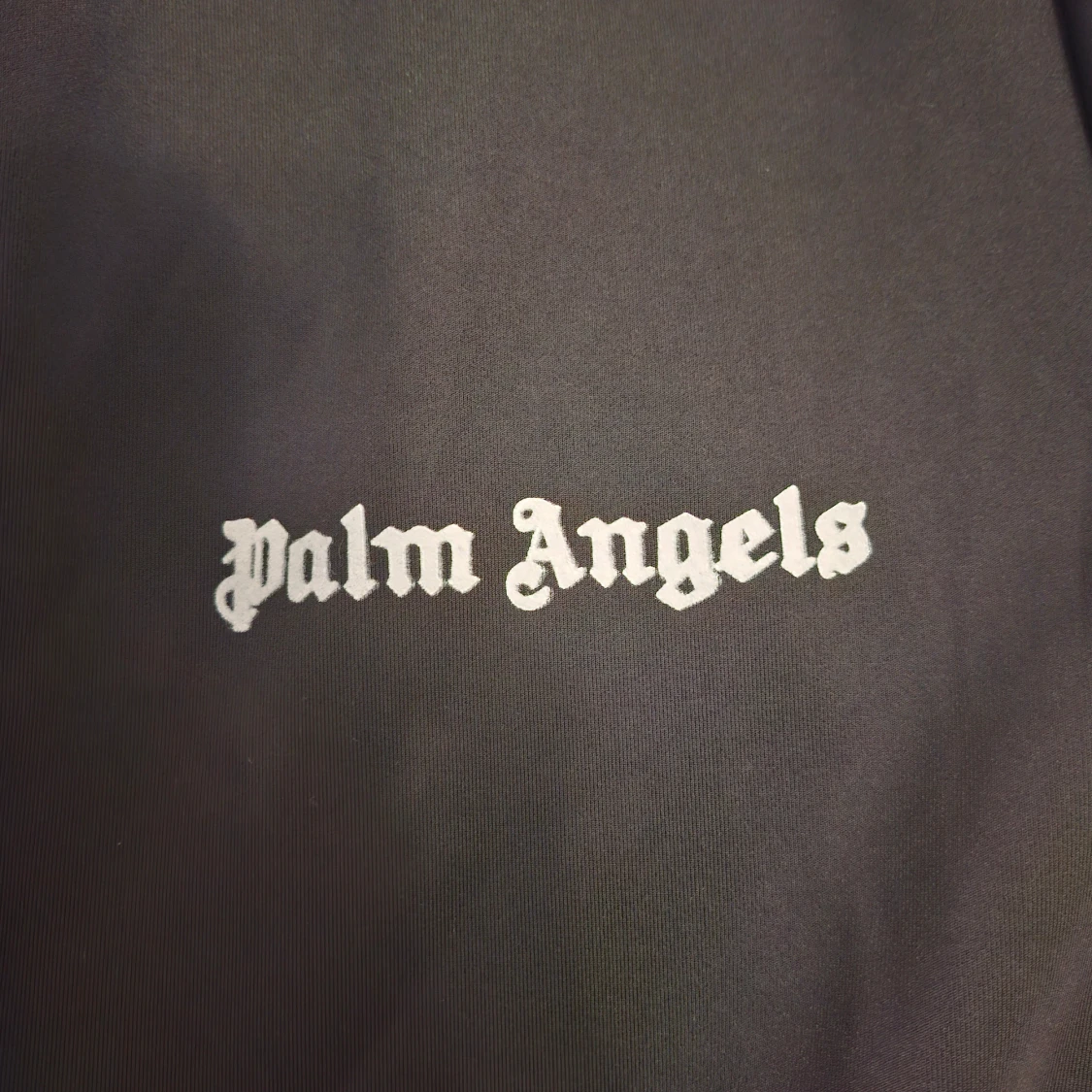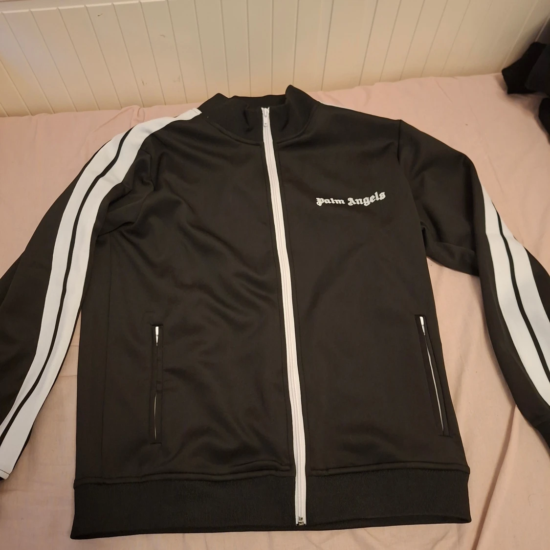 Svart track jacket från Palm Angels med vita ränder längs ärmarna och vit dragkedja framtill. Jackan har ståkrage, två fickor med dragkedja och Palm Angels-logga på bröstet. Snygg och sportig stil, perfekt för streetwear.