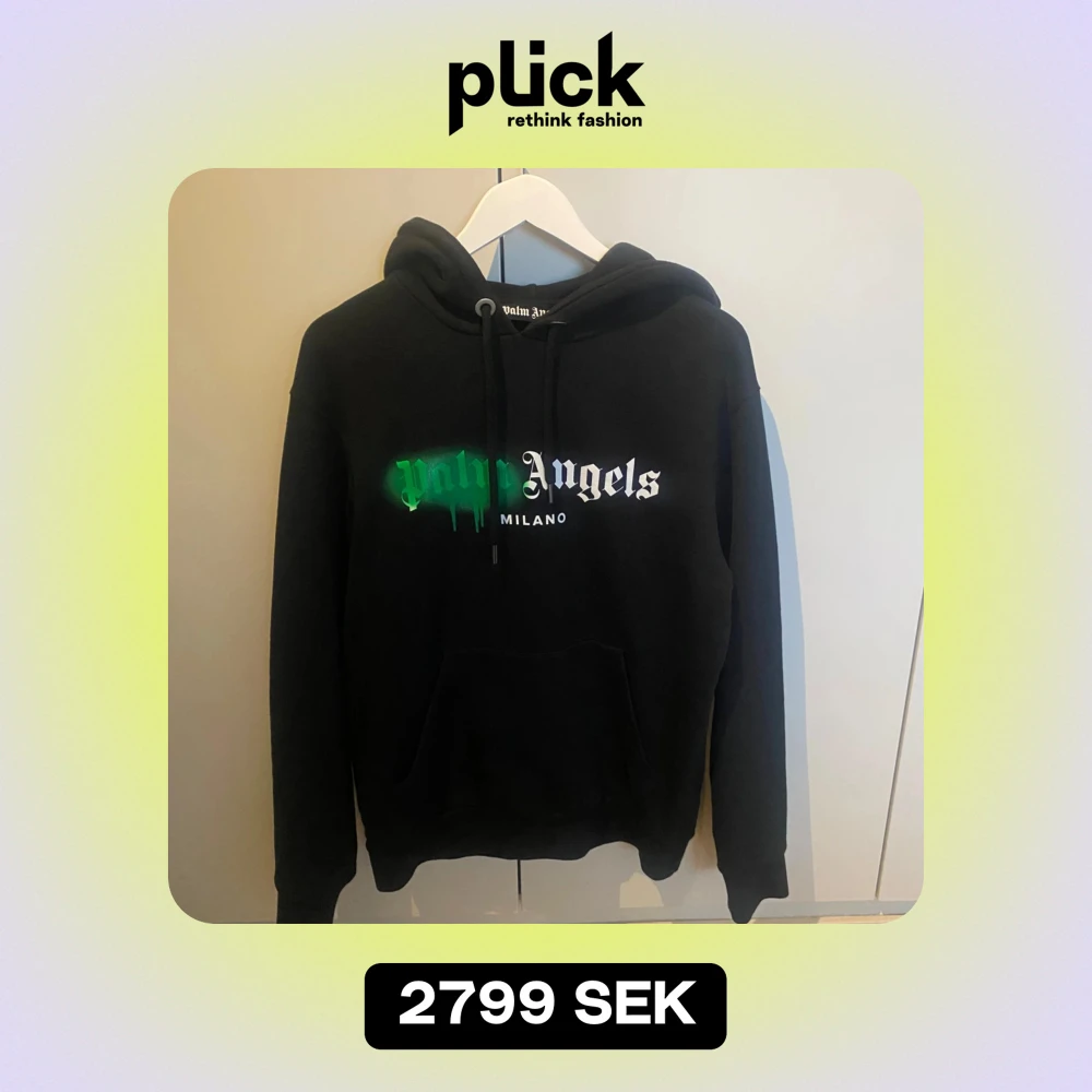 Säljer en svart hoodie från Palm Angels med coolt grönt och vitt tryck på framsidan. Den har en klassisk passform med långa ärmar och en bekväm huva. Perfekt för både vardag och chill. Hör av dig vid intresse! 🖤 och har äkta bevis och pris kan diskuteras