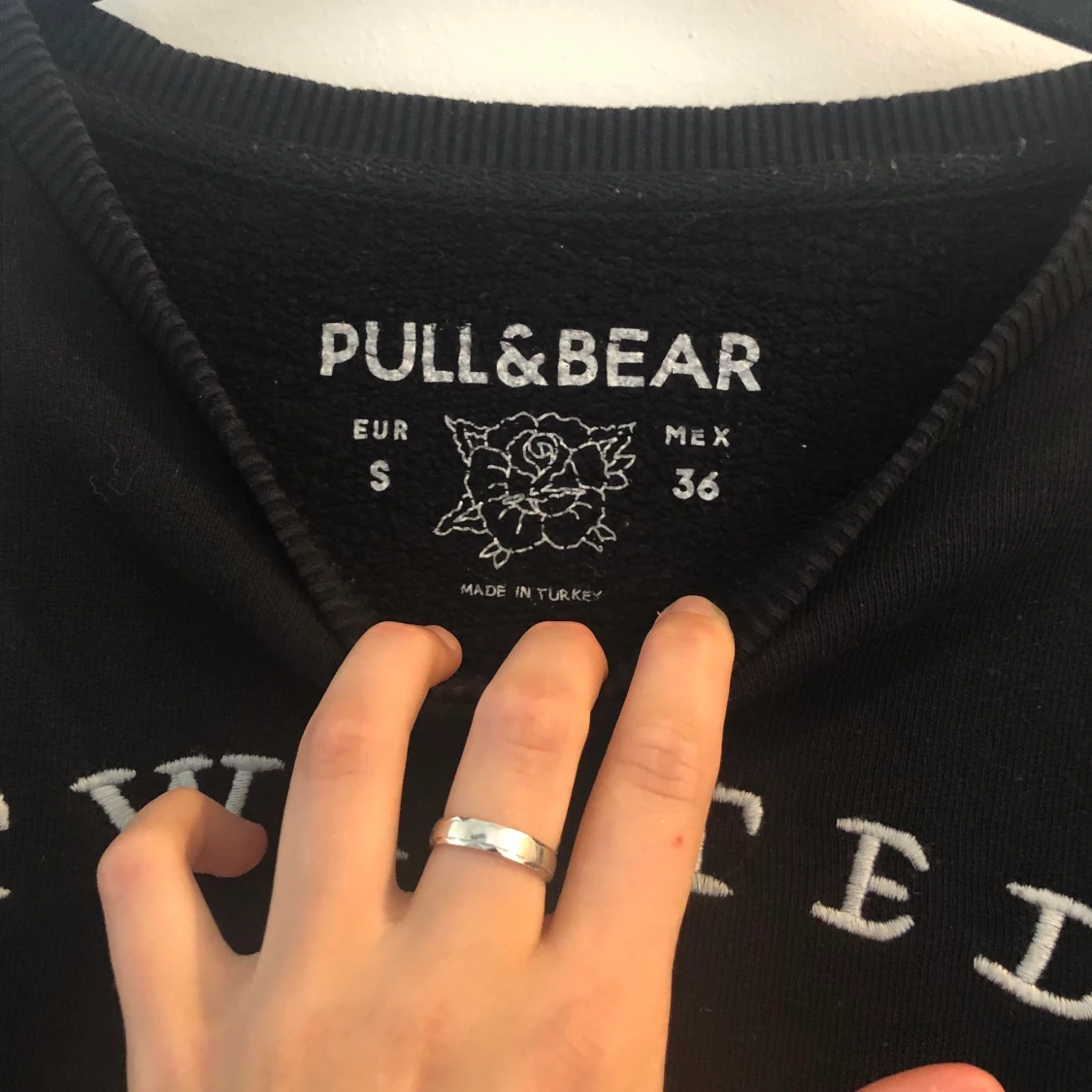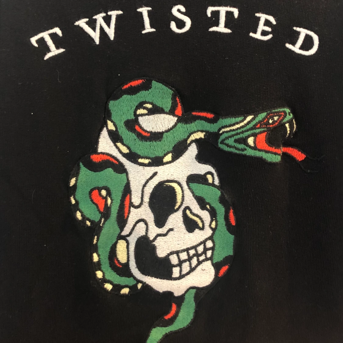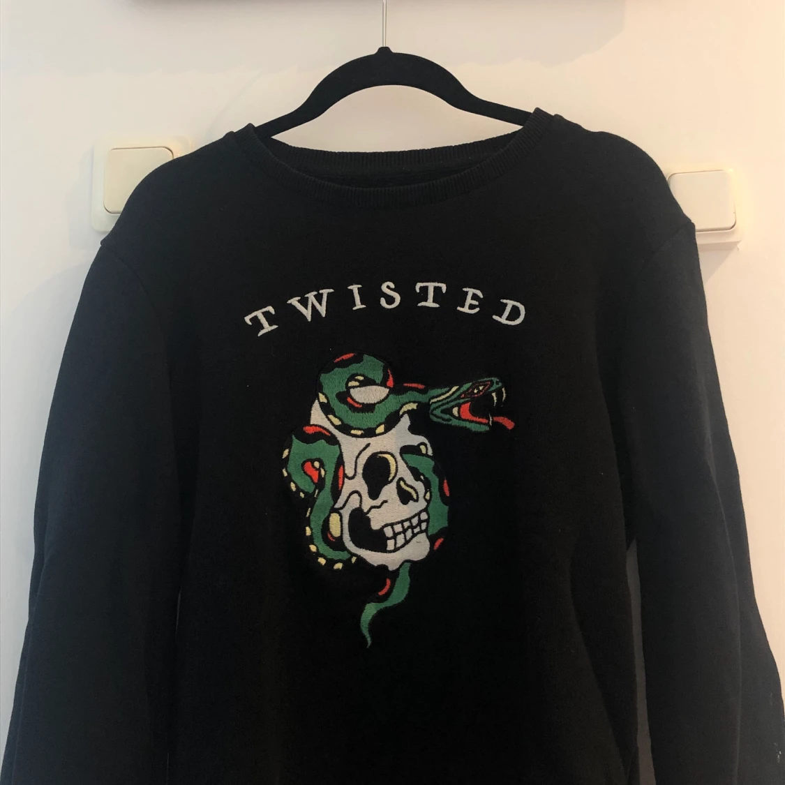 Svart tjocktröja med sydd text och orm. Storlek S nästintill aldrig använda.