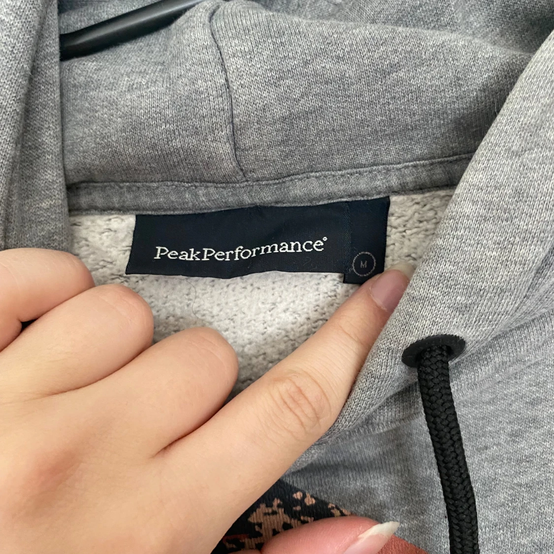 Supersnygg peak performance hoodie. Har en liten gul fläck högt upp på ryggen och en liten rosa fläck på luvan men inget man tänker på