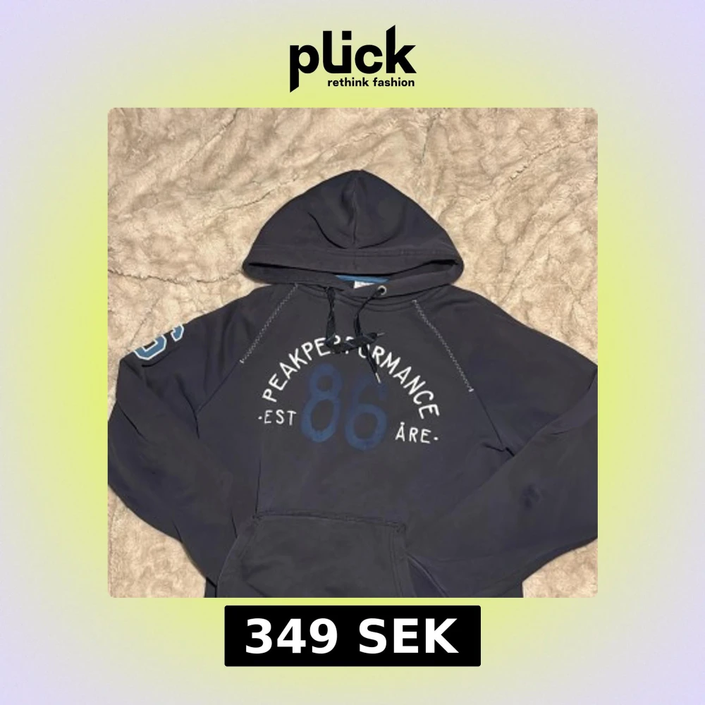 Mörkblå hoodie från Peak Performance med tryck 'Peak Performance 86 Åre' på bröstet och siffran 86 på ärmen. Klassisk huva med snörning och känguruficka framtill. Perfekt för chill dagar eller när du vill ha en sportig look.
