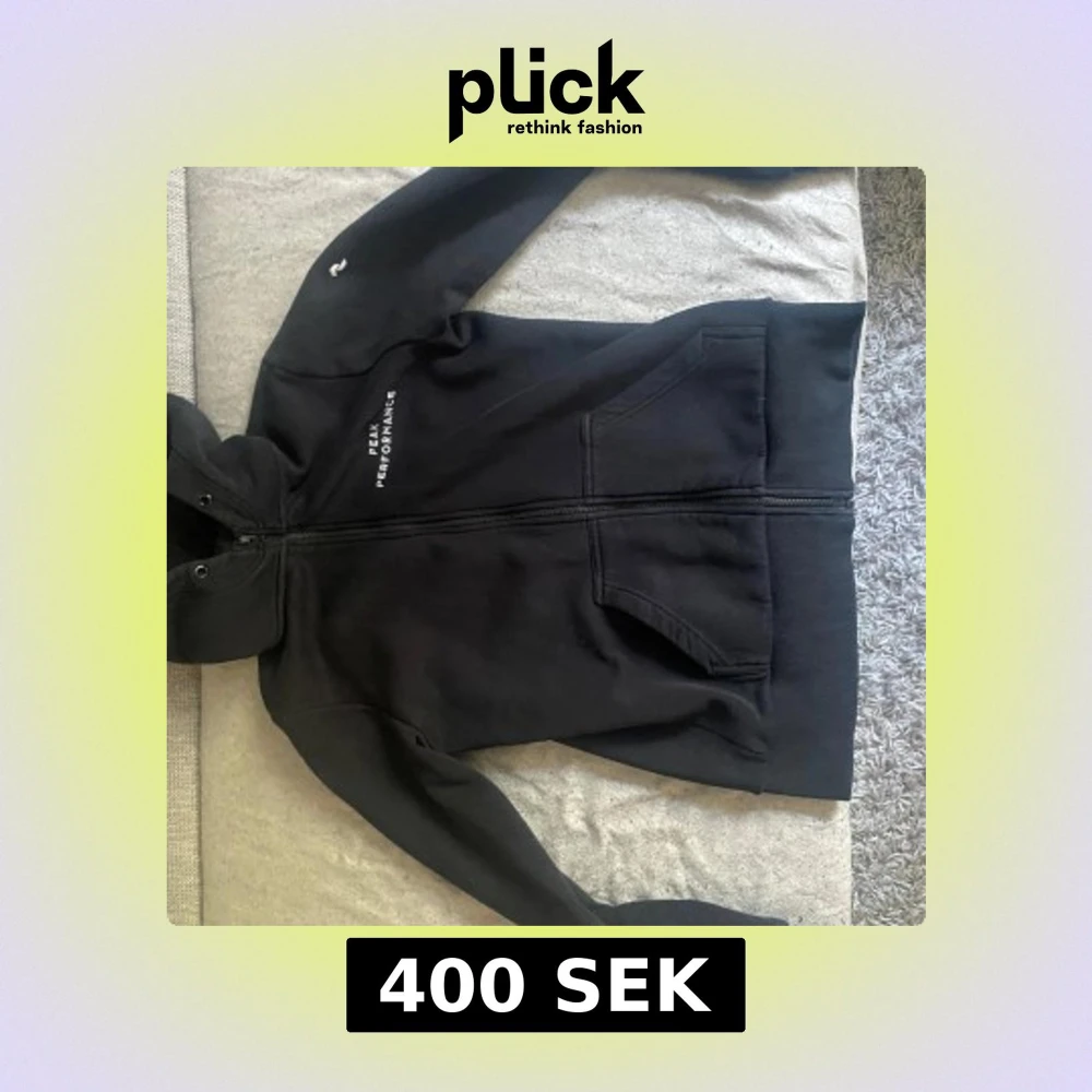 Svart hoodiejacka från Peak Performance med dragkedja framtill och två fickor. Jackan har huva, ribbade muddar och logga på bröstet. Knappt använd passar storlek M