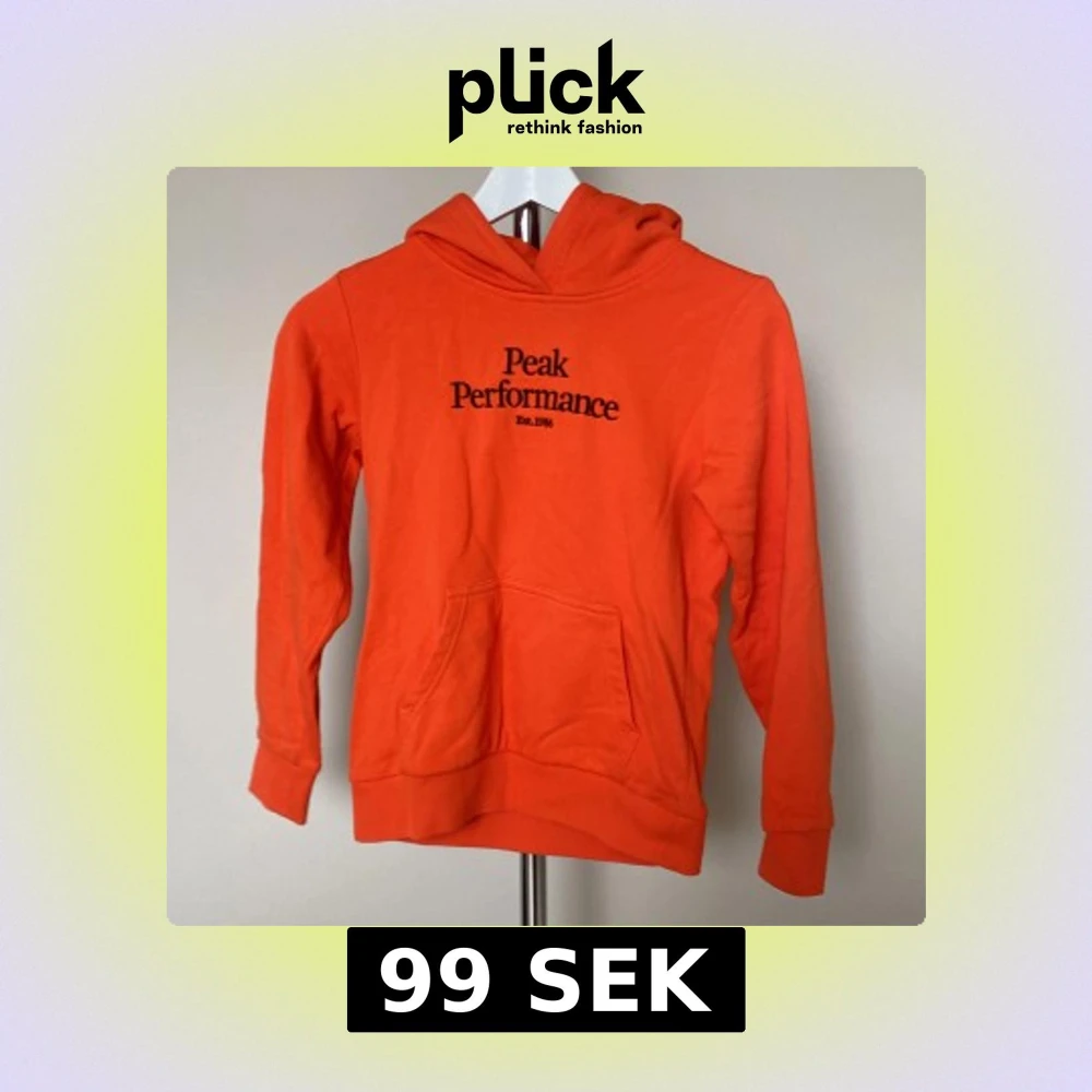 Säljer en snygg orange hoodie från Peak Performance med svart tryck på bröstet. Tröjan har huva, magficka och långa ärmar. Perfekt för dig som gillar sportig och avslappnad stil. Materialet är mjuk bomull som känns skönt mot huden.