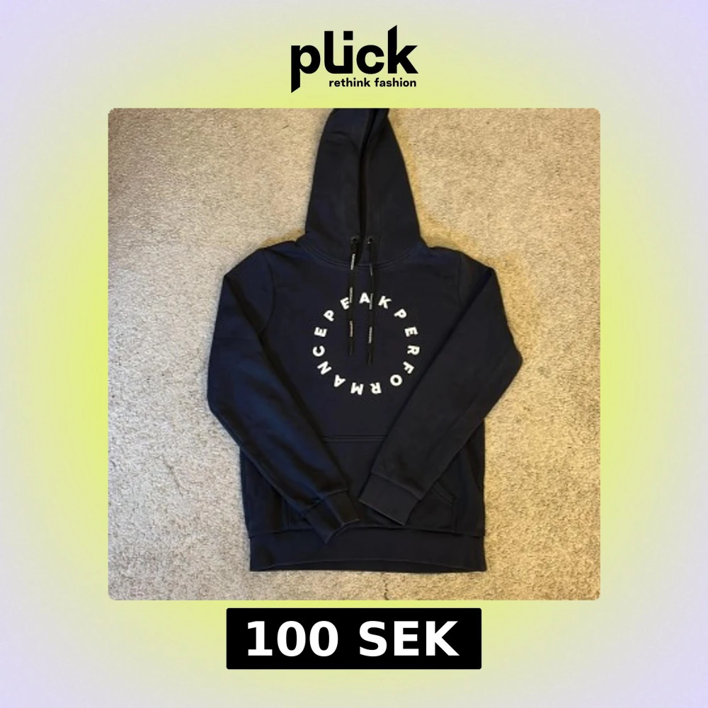 Snygg mörkblå hoodie från Peak Performance med vit logga i cirkel på bröstet. Tröjan har huva med snörning, magficka och långa ärmar. Perfekt för chill eller när du vill vara bekväm men ändå se fräsch ut.