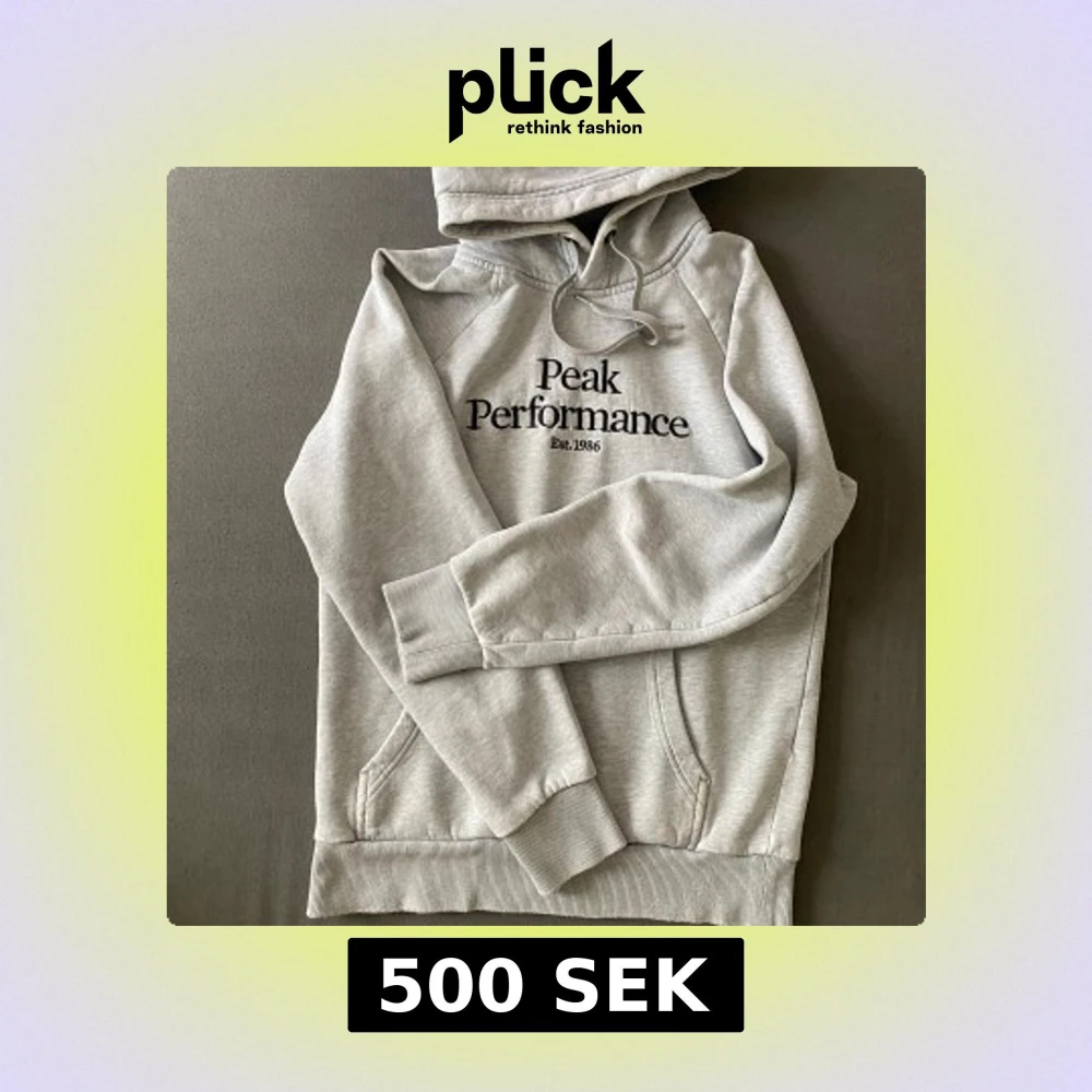 Säljer en ljusgrå hoodie från Peak Performance med svart broderad logga på bröstet. Tröjan har luva med snöre och en magficka.