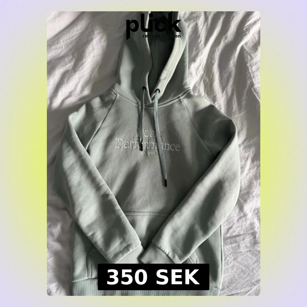 Jag säljer en snygg ljusgrön hoodie från Peak Performance med vit logga på bröstet. Klassisk modell med huva, dragsnören och magficka. Mjuk bomullskänsla och bekväm passform.
