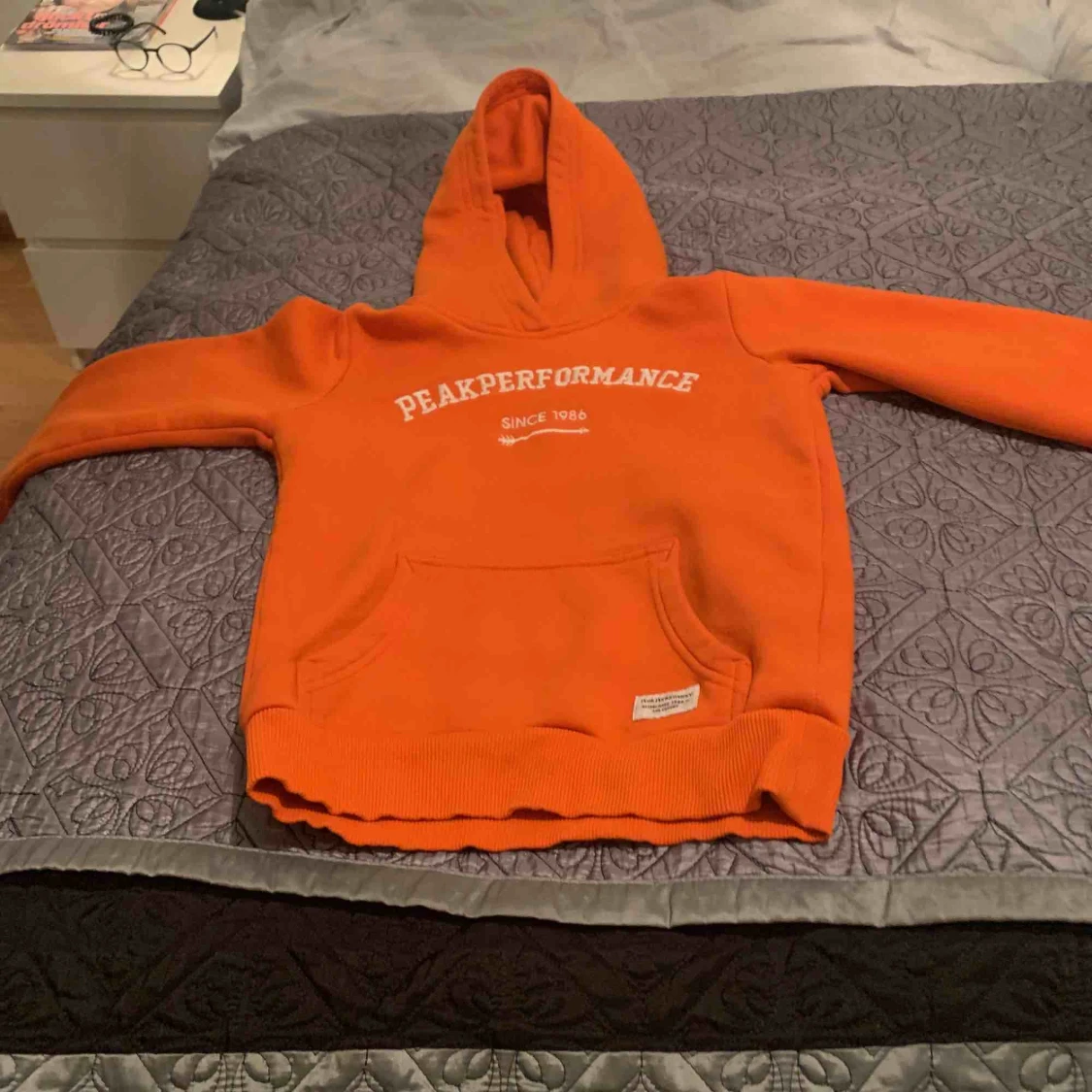 En fin orange hoodie från peak storlek 130
