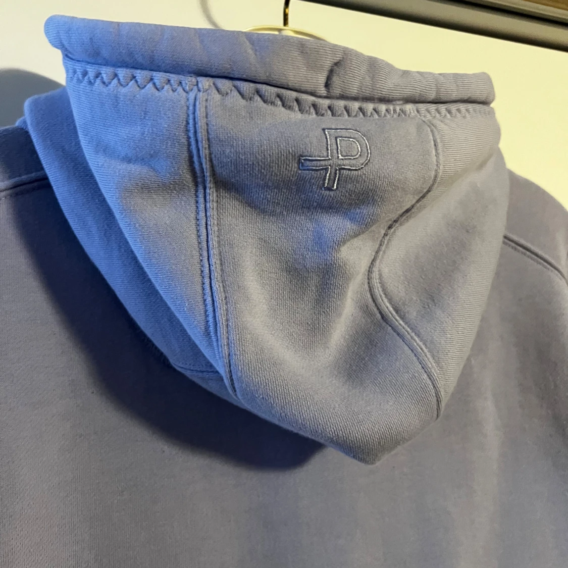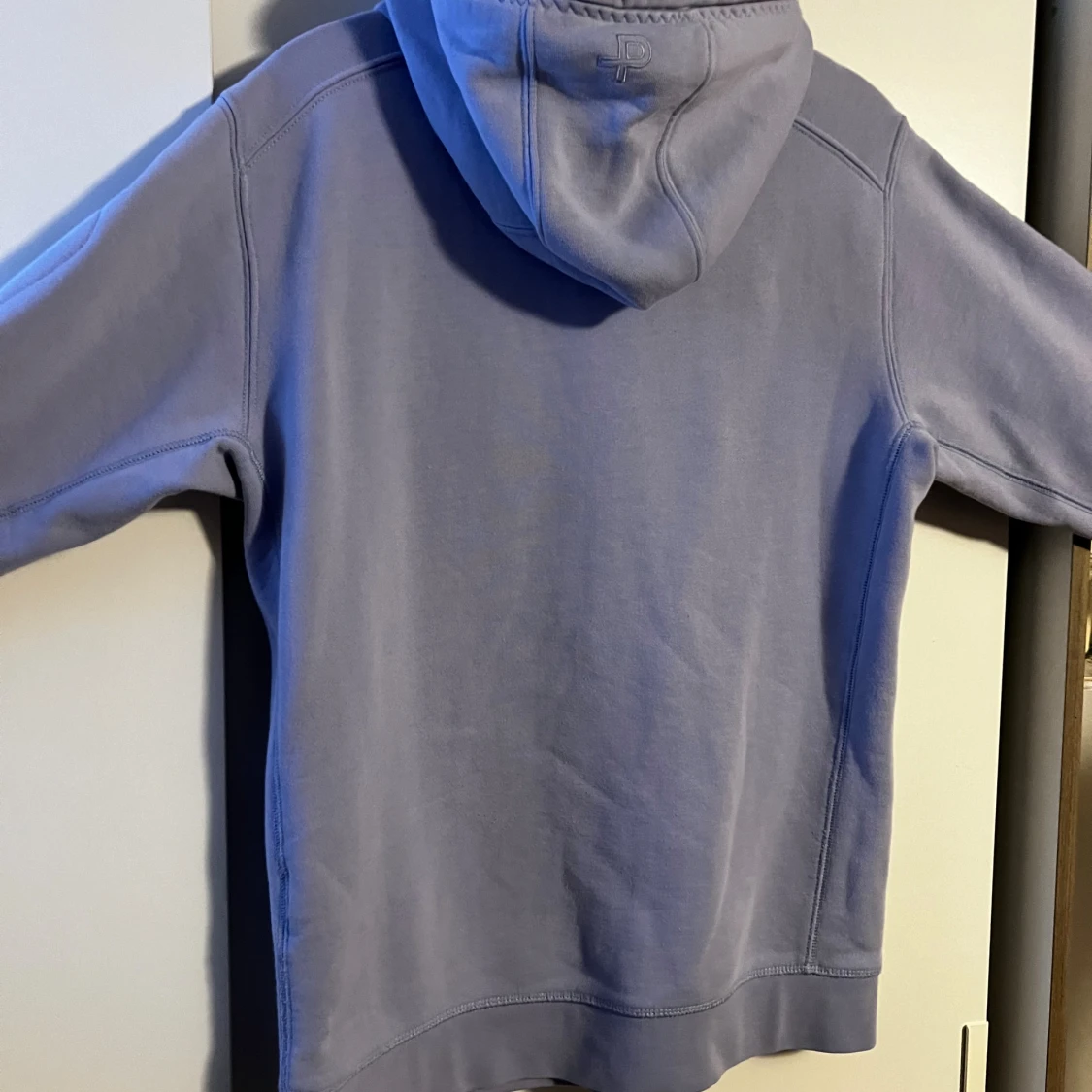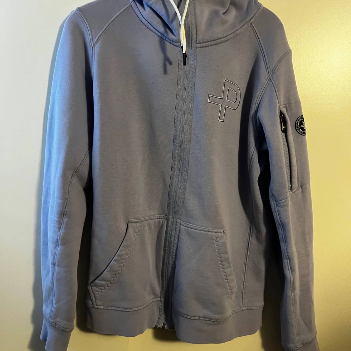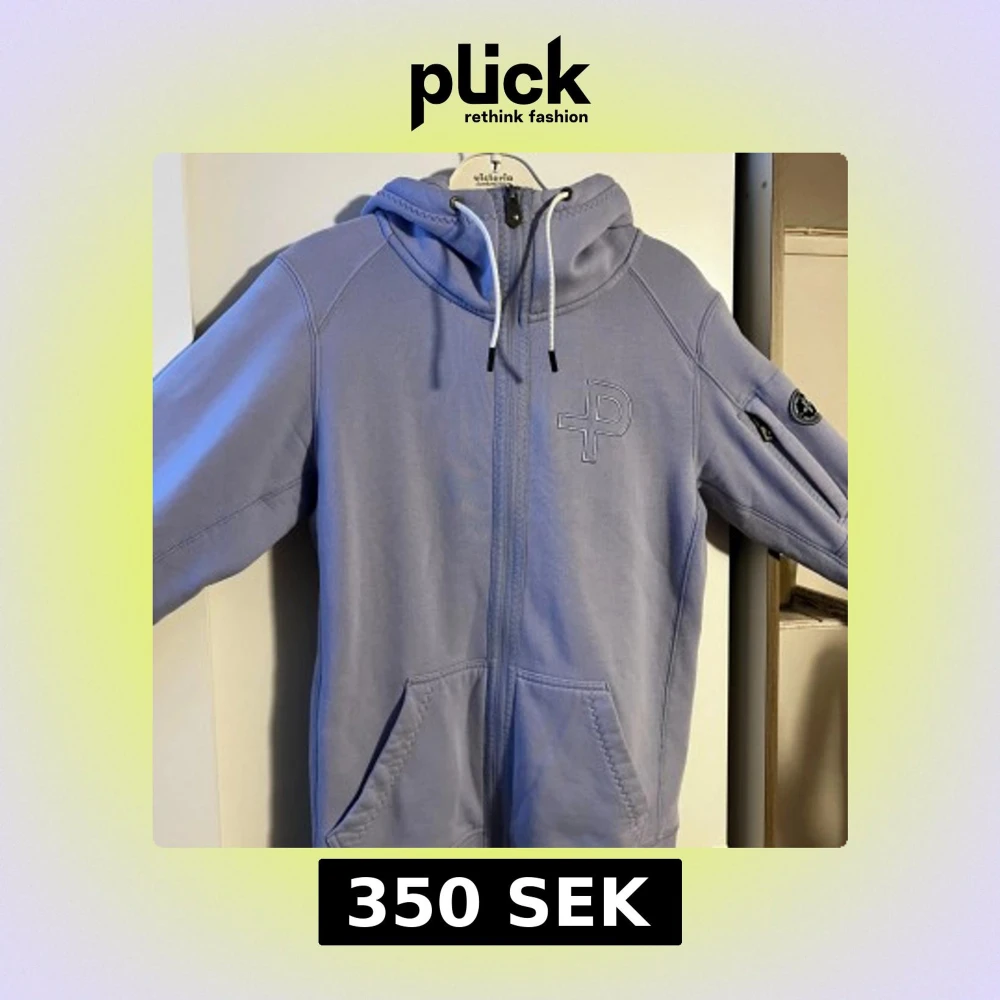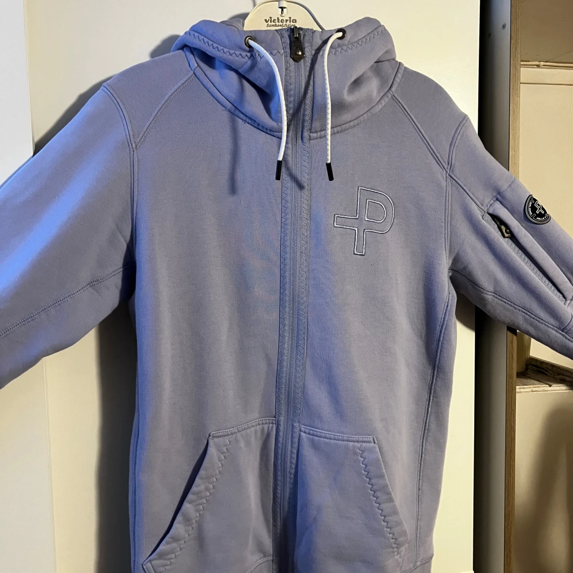 Snygg ljuslila hoodie från Pelle P med dragkedja, huva med snörning och två stora fickor fram. Broderad logga på bröstet och patch på ärmen.