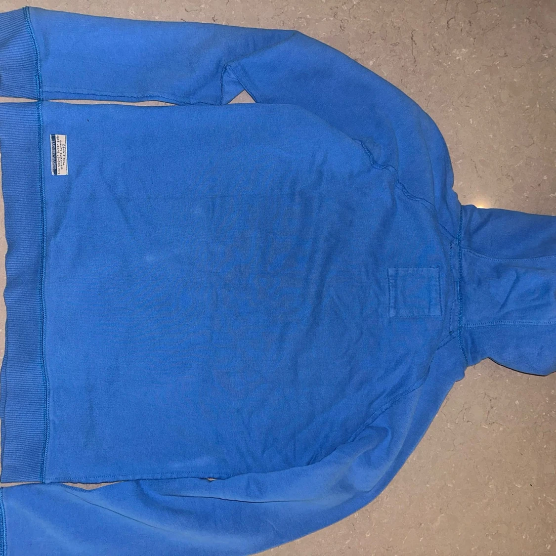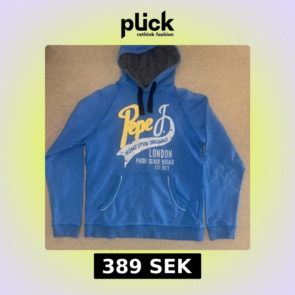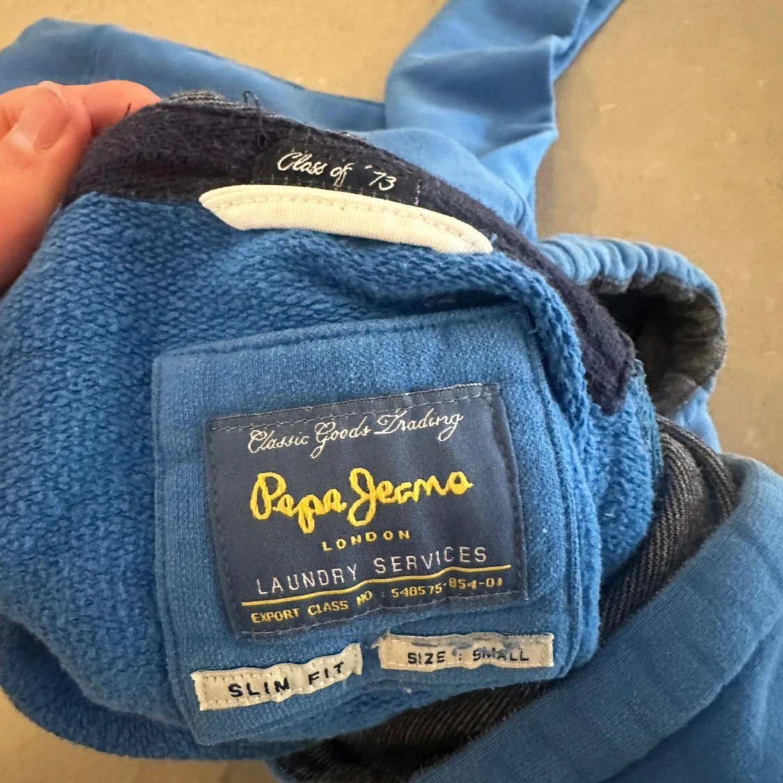 Snygg blå hoodie från Pepe Jeans London med tryck i gult och vitt framtill. Tröjan har huva med mörkblå snören, känguruficka och ribbade muddar. Slim fit-modell i mjuk bomull, perfekt för en avslappnad stil.