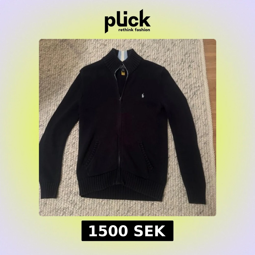 Svart stickad kofta från Polo Ralph Lauren med dragkedja framtill och ribbad krage med vit och ljusblå rand på baksidan. Klassisk broderad logga på bröstet och två fickor fram. En perfekt tröja/hoodie nu till vintern. Denna tröja säljs för 2000 som ny i affär, priset är inte skrivet i sten och kan förhandlas