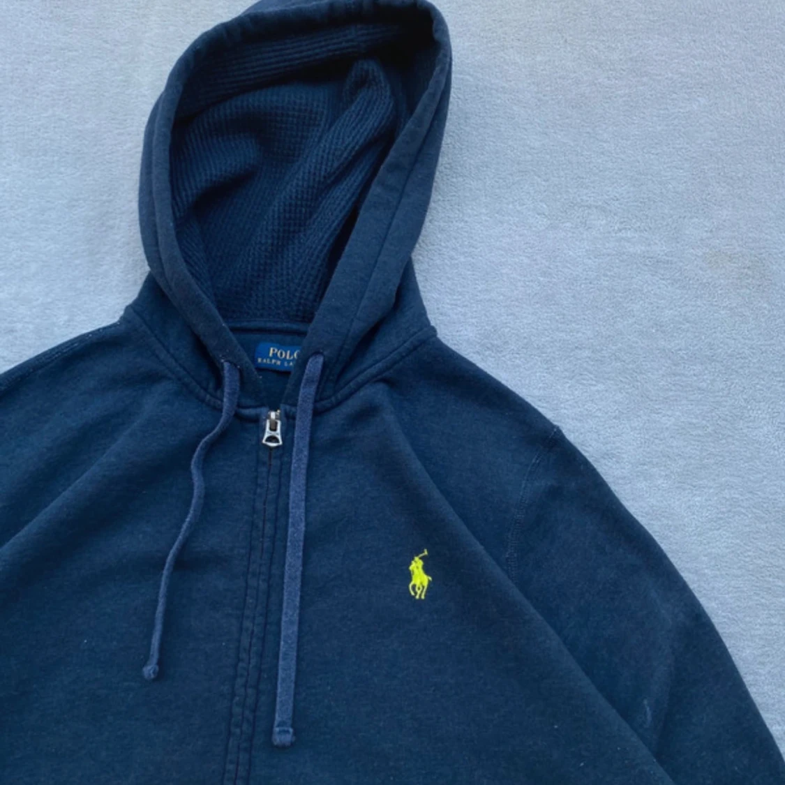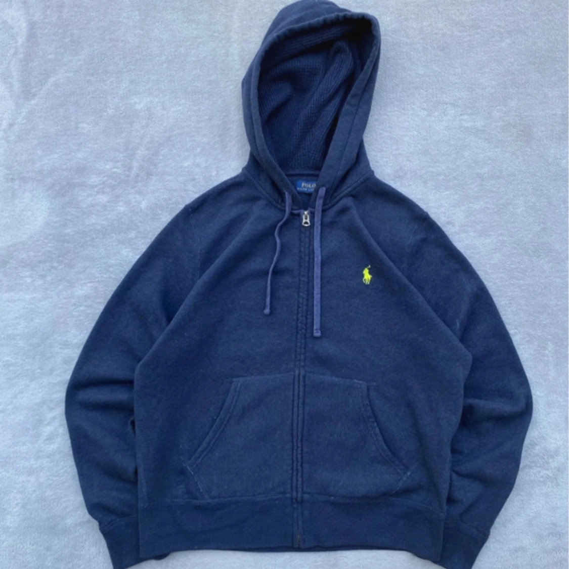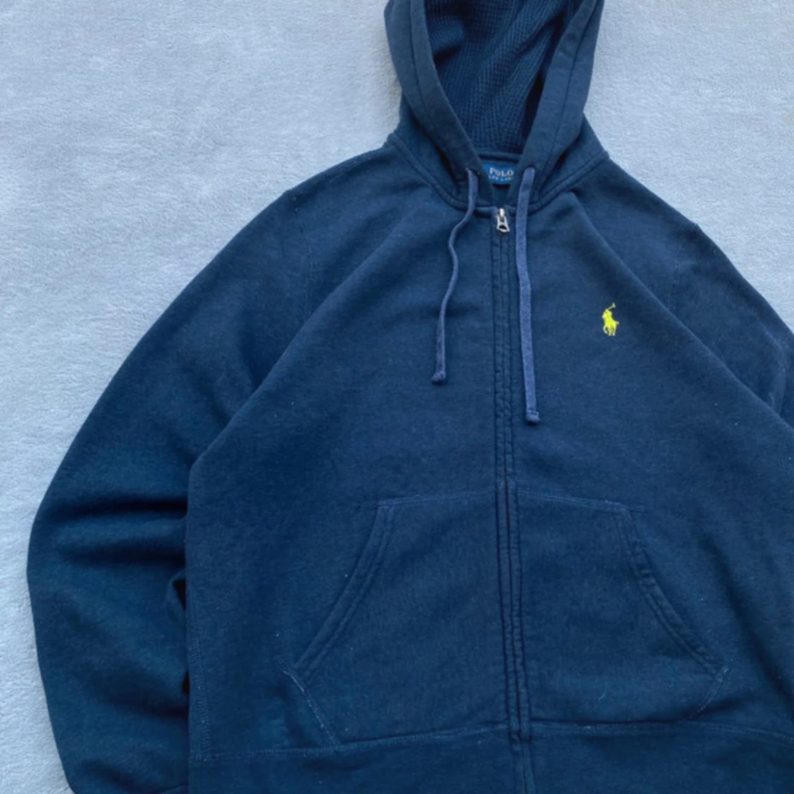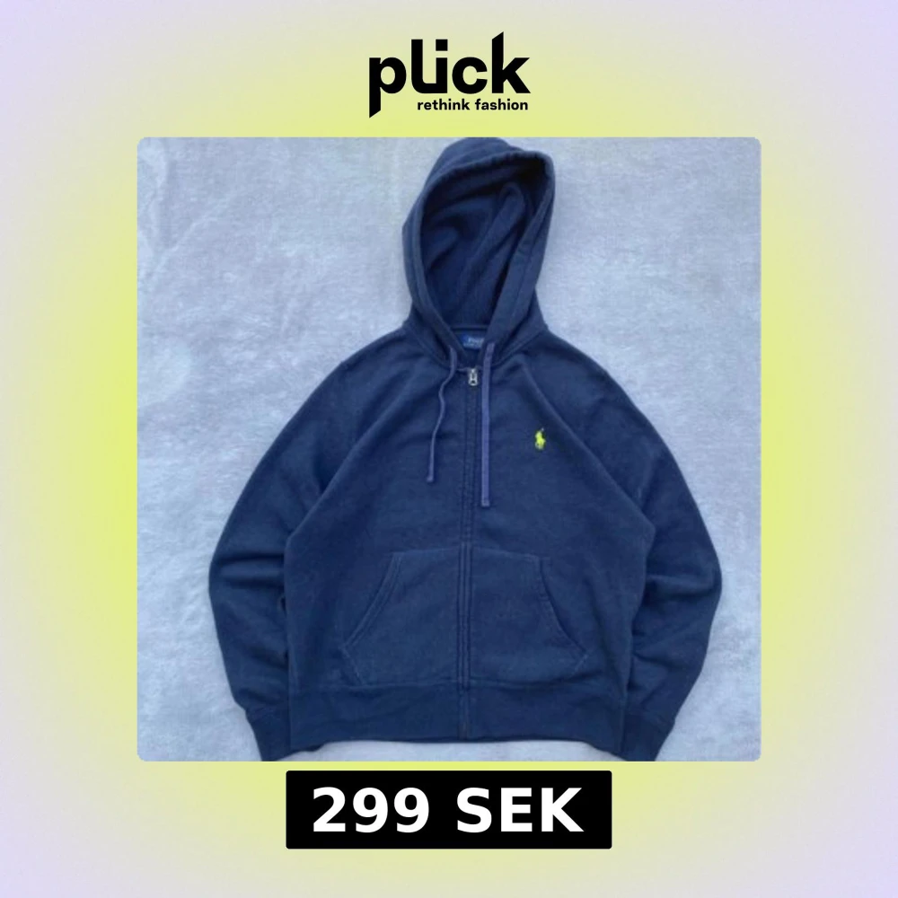 Snygg mörkblå hoodie i XS från Polo Ralph Lauren med dragkedja och huva. Tröjan har snörning i huvan och den klassiska gula broderade loggan på bröstet. Perfekt för en chill och stilren look.