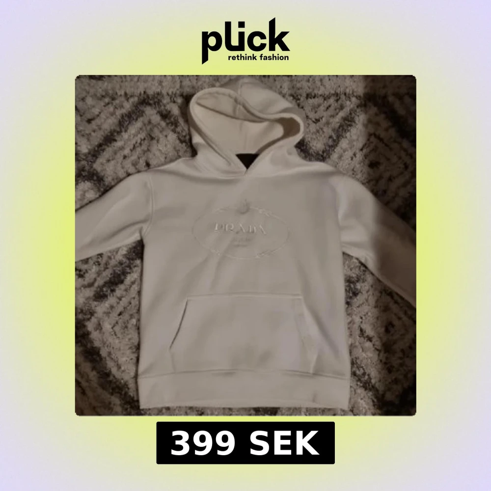 Säljer en stilren vit hoodie från Prada med broderad logga på bröstet. Tröjan har huva, magficka och klassisk passform. Perfekt för dig som gillar exklusiva märken och enkel design.