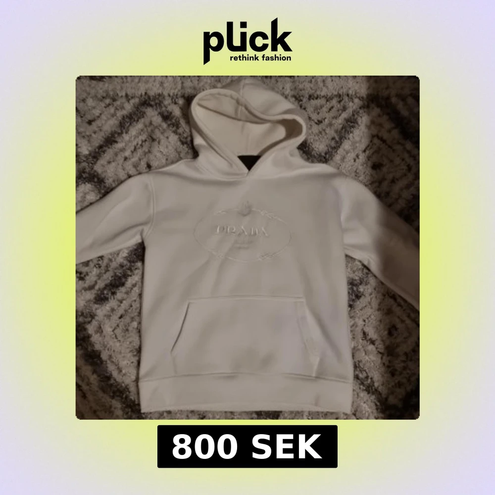 Säljer en stilren vit hoodie från Prada med broderad logga på bröstet. Tröjan har huva, magficka och långa ärmar. Mjuk insida och klassisk passform, perfekt för dig som gillar exklusiva märken och enkel design.