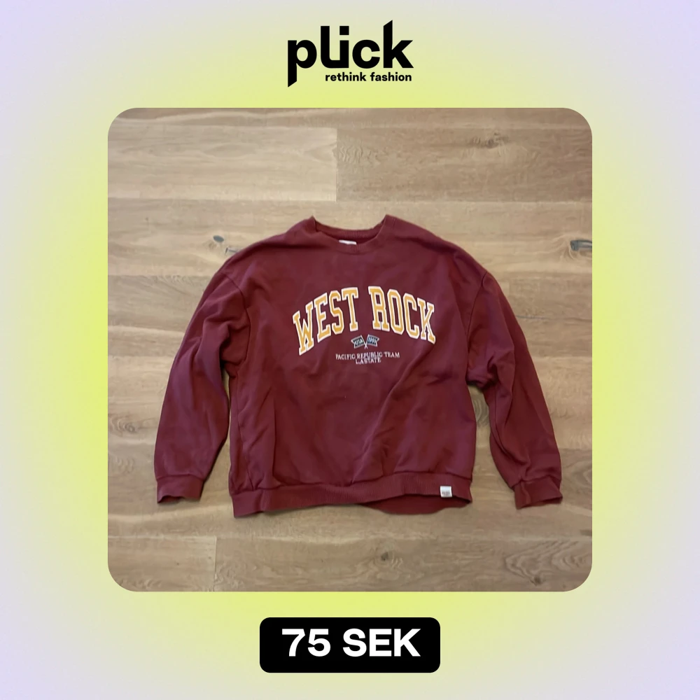 Säljer en vinröd sweatshirt med texten 'West Rock' i gult och vitt på framsidan. Tröjan är i bra skick och perfekt för en avslappnad stil. Den har långa ärmar och en bekväm passform. Perfekt för höst och vinter!