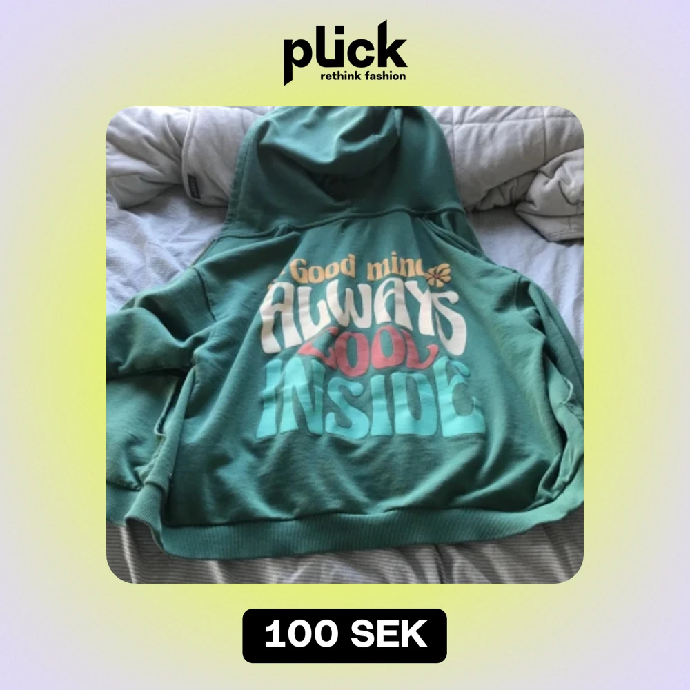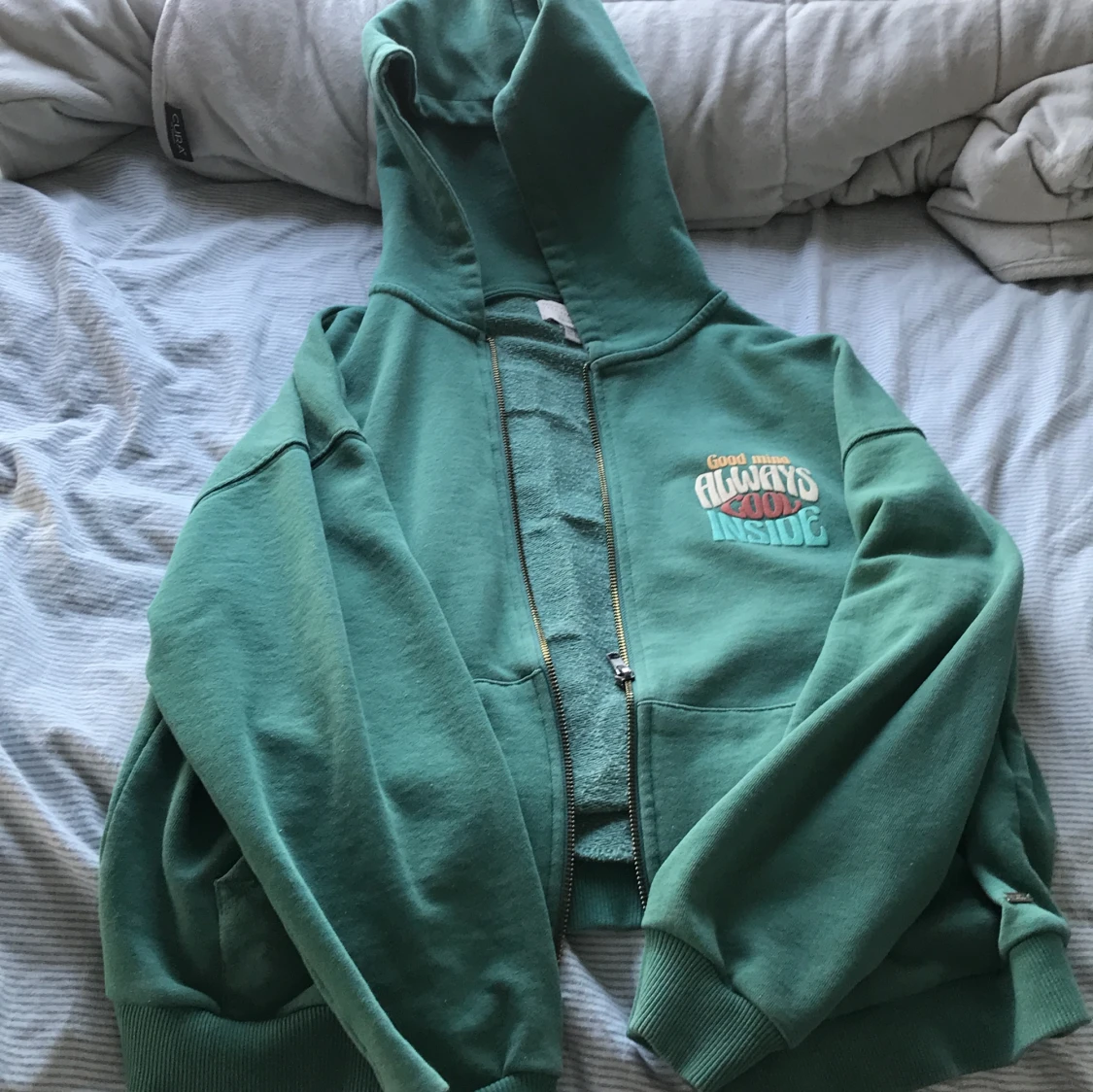 Det är en hoodie i storlek S, från pull and bear, grön?