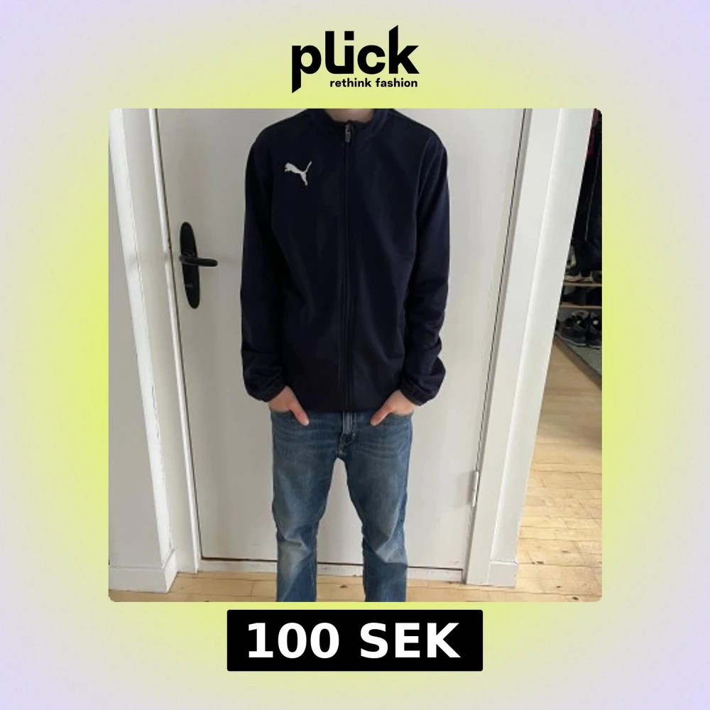 Säljer en marinblå Puma tröja i storlek YXL (passar ca 160–170 cm). Den har en dragkedja framtill, hög krage och Puma-logga tryckt på bröstet. Lätt och bekvämt material som passar för träning eller vardagsbruk. Personen på bilderna är 160 cm lång, 12 år gammal, och har en smal/normal kroppsbyggnad. Skick: Bra begagnat skick, med minimala tecken på användning. Nypris: 400 SEK