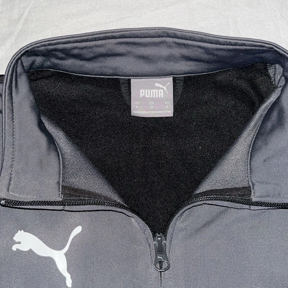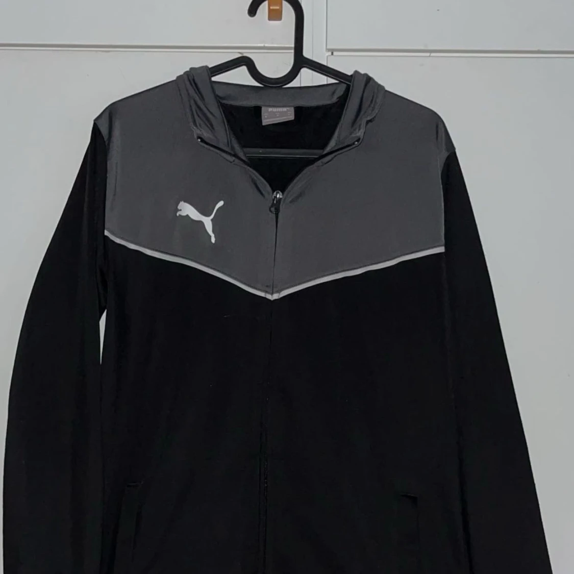 Kom med pris. Svart och grå hoodie från Puma med dragkedja framtill och huva. Hoodie har en sportig look med kontrastpanel upptill och Puma-logga på bröstet. Perfekt för dig som gillar streetwear och vill ha en lätt hoodie till vardagen.