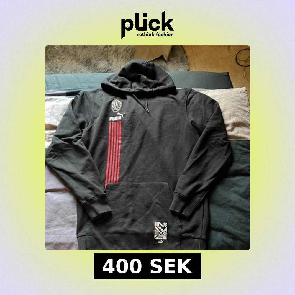 Svart hoodie och byxa från Puma i samarbete med AC Milan. Tröjan har huva med dragsko, magficka och röda vertikala ränder på framsidan samt AC Milan-logga och Puma-logga på bröstet. Ribbstickade muddar vid ärmslut och nederkant.