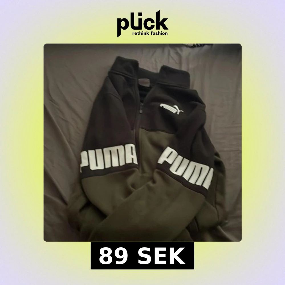 Snygg svart och olivgrön jacka från Puma med dragkedja framtill och stora vita logotyper på ärmarna. Jackan har hög krage, två fickor och är tillverkad i mjukt syntetmaterial. Perfekt för dig som gillar sportig och street-inspirerad stil.