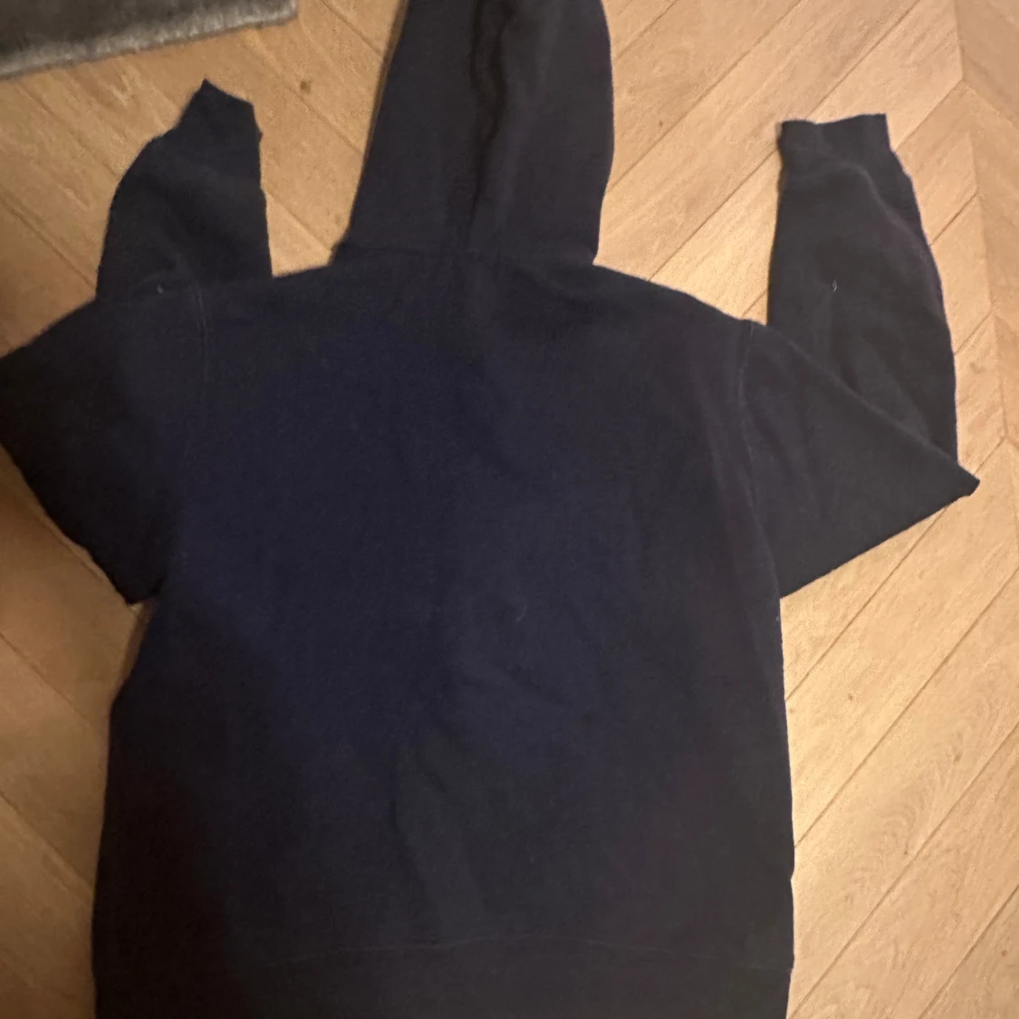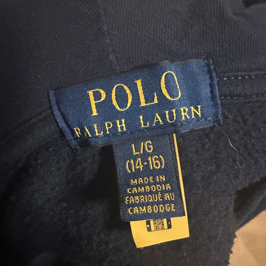 Säljer en snygg mörkblå hoodie från Ralph Lauren med dragkedja och huva. Den har en liten röd logga på bröstet och praktiska fickor framtill. Perfekt för en avslappnad stil.
