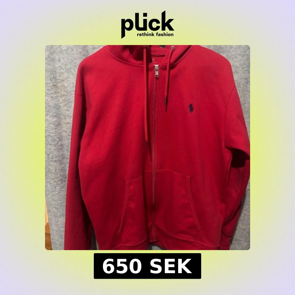 Säljer en klassisk röd hoodie från Polo Ralph Lauren med dragkedja och två fickor framtill. Tröjan har huva med dragsko och en broderad blå logga på bröstet. Perfekt för en avslappnad stil.