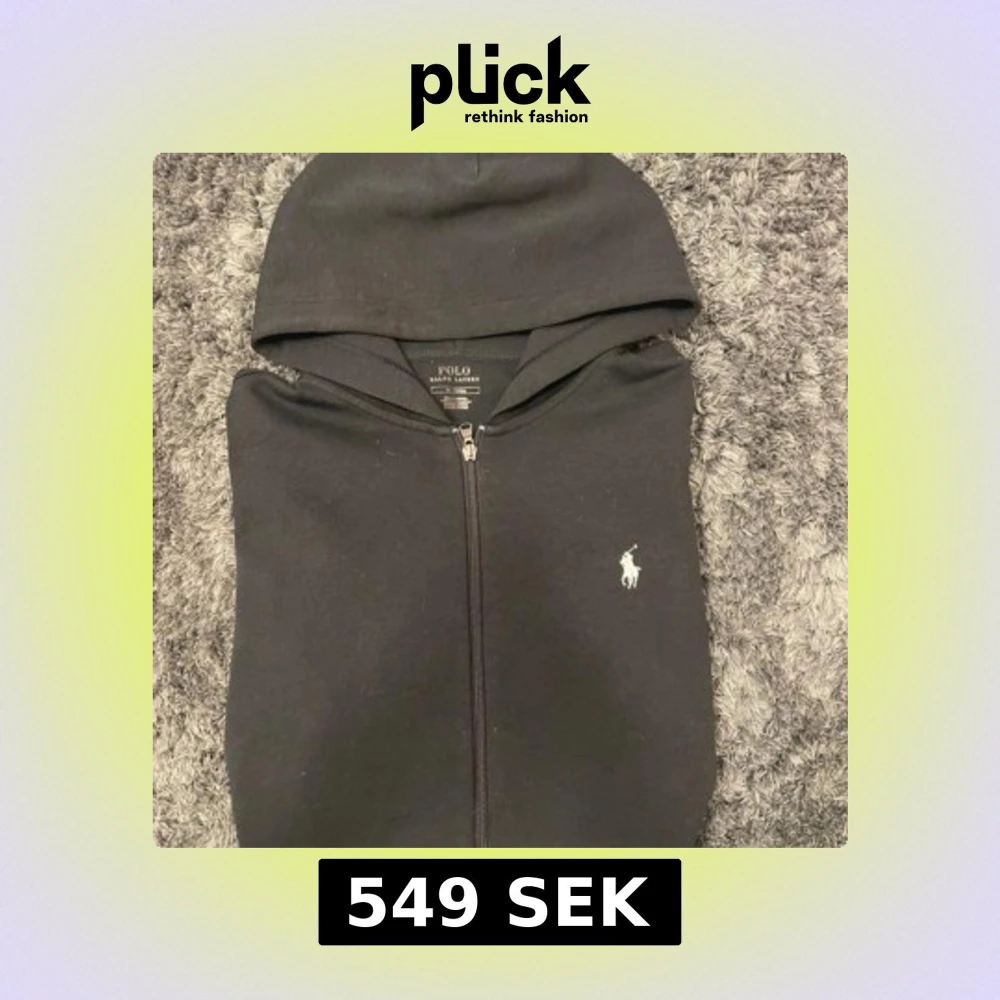 Svart hoodie från Polo Ralph Lauren med dragkedja och klassisk vit logga på bröstet. Tröjan är i storlek M och är i bra skick för utom den minimala slitningen vid botten