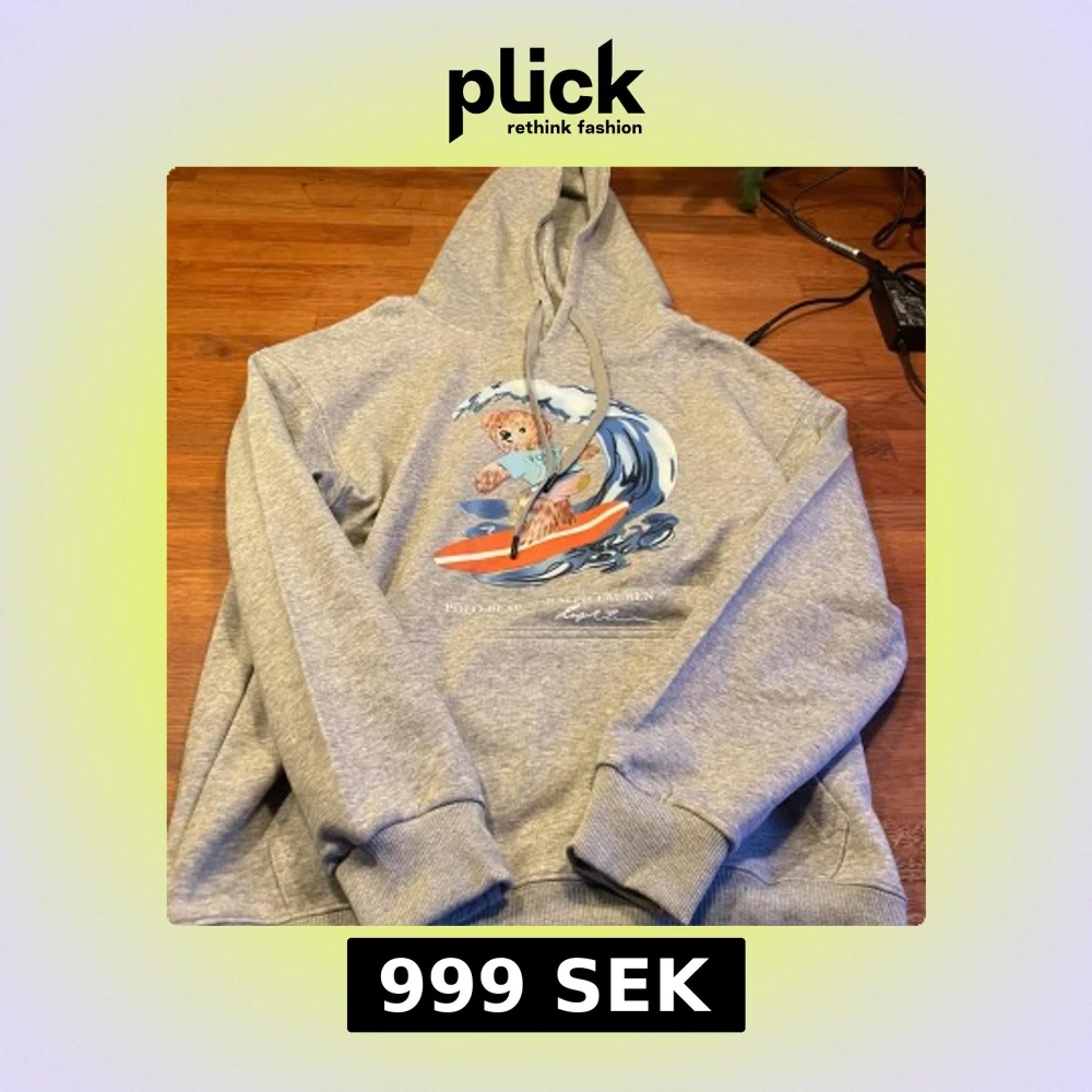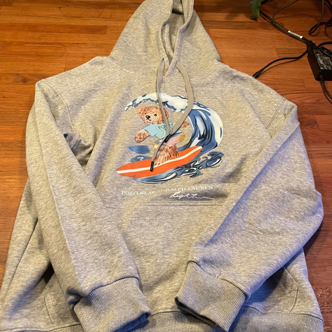 Grå hoodie från Ralph Lauren med Polo Bear-tryck där nallen surfar på en våg. Tröjan har huva med snörning, ribbade muddar och klassisk passform. Materialet är mjuk bomullsmix som känns skön mot huden. Perfekt för chill dagar och streetwear-vibe.