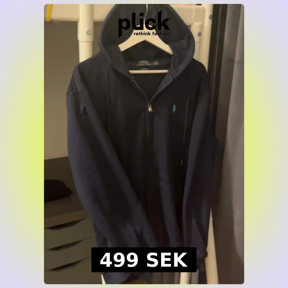 Säljer en mörkblå hoodie från Polo Ralph Lauren i storlek L. Tröjan har huva med snörning, dragkedja framtill och det klassiska Polo-logot broderat i turkos på bröstet. Materialet är mjuk bomull och passformen är normal. Perfekt för chill dagar.