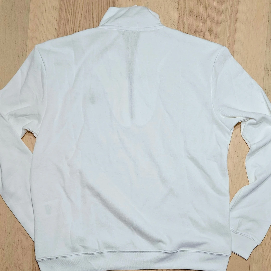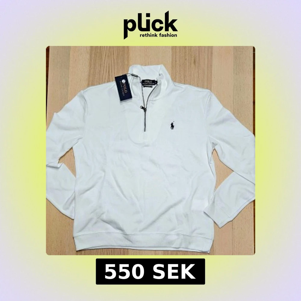 Säljer en stilren vit tröja från Polo Ralph Lauren med halv dragkedja och klassisk logga på bröstet. Perfekt för en avslappnad men ändå snygg look. Tröjan har långa ärmar och är tillverkad i ett mjukt material.