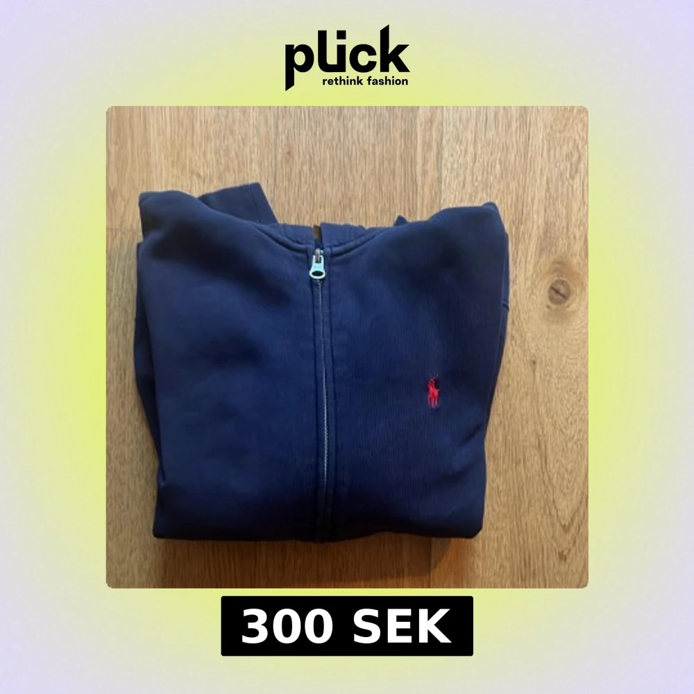 Snygg marinblå hoodie från Polo Ralph Lauren med dragkedja och klassisk röd logga på bröstet. Tröjan har huva, känguruficka och långa ärmar. Perfekt för chill dagar och enkel att matcha med jeans eller joggers. Hoddien är använd mycket men fortfarande i bra kvalitet. Storlek M (10-12)