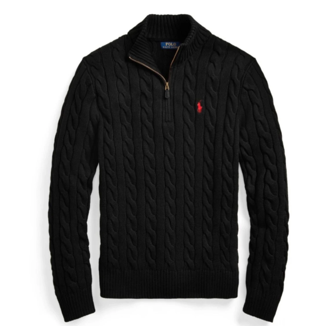 Säljer en stilren svart stickad tröja från Polo Ralph Lauren med dragkedja vid halsen. Tröjan har ett klassiskt flätmönster och den ikoniska röda logotypen på bröstet. Perfekt för kyliga dagar!