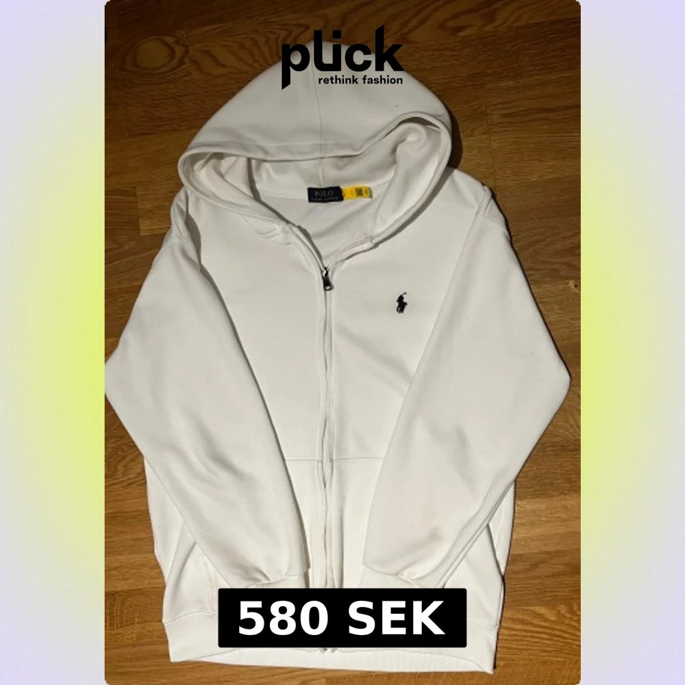 Snygg vit hoodie från Polo Ralph Lauren med klassisk svart logobroderi på bröstet. Tröjan har huva, dragkedja framtill och ribbade muddar vid ärmar och nederkant. Endast använd ett par gånger.