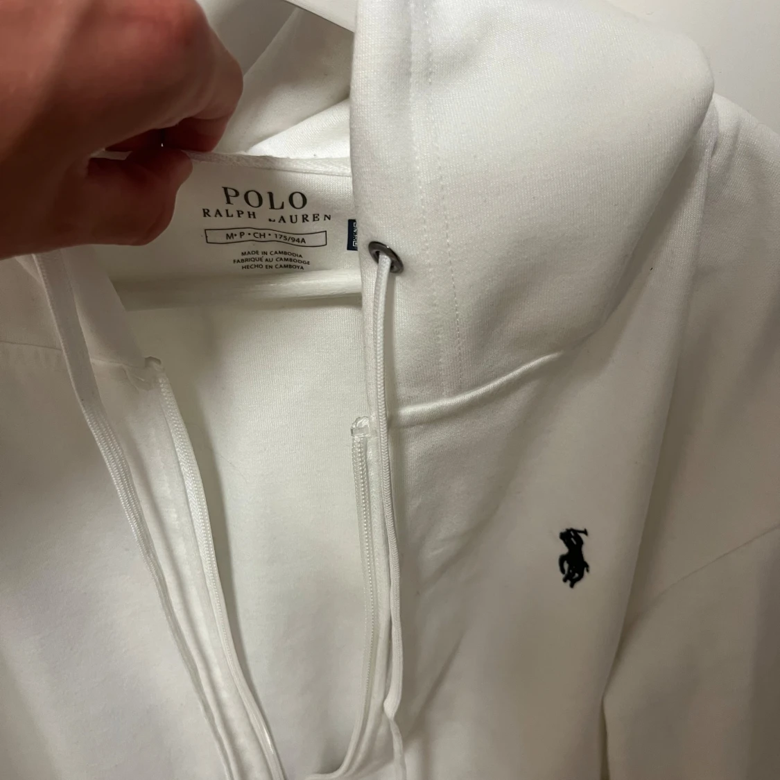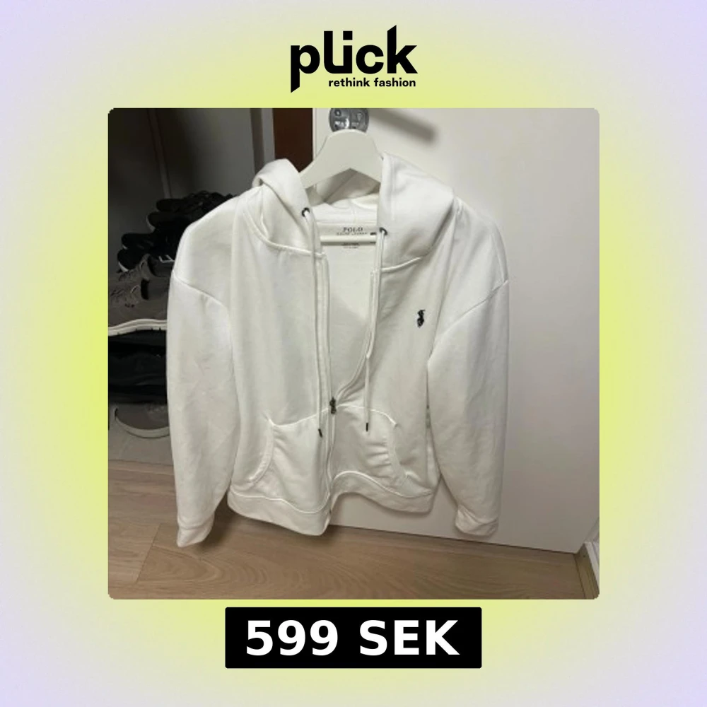 Snygg vit hoodie från Polo Ralph Lauren med dragkedja, huva och klassisk logga broderad på bröstet. Tröjan har känguruficka och justerbara snören i huvan. Perfekt för en chill och stilren look. Enda defekten är att snörena är lite långa, har bytat ut orginalsnörena.
