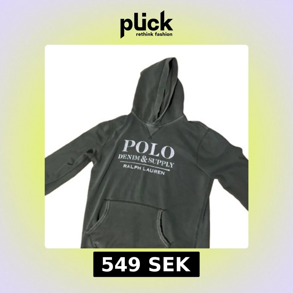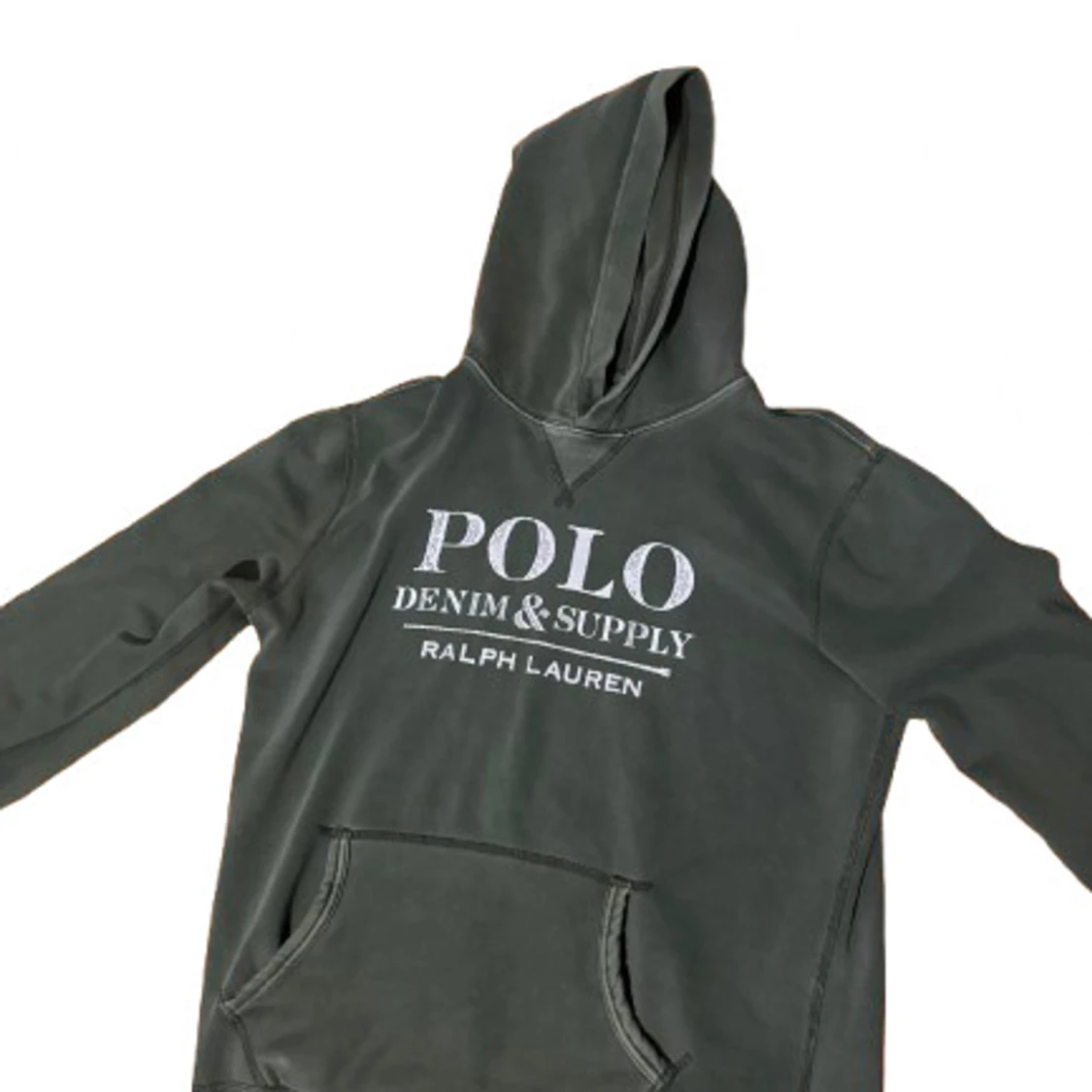 Säljer en snygg grön hoodie från Ralph Lauren med texten 'POLO DENIM & SUPPLY' på bröstet. Tröjan har en klassisk design med huva och en stor ficka framtill. Inga defekter, skriv vid frågor😊