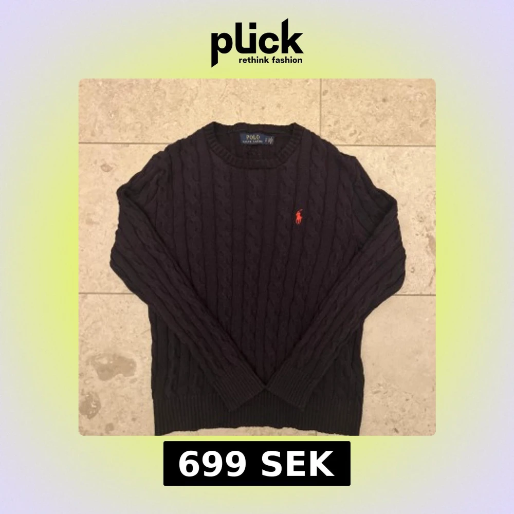Kabelstickad mörkblå tröja från Polo Ralph Lauren med klassisk rund hals och lång ärm. Tröjan har det ikoniska röda Polo-logot broderat på bröstet och ribbade muddar vid ärmslut och nederkant. Storlek Small. Väldigt bra skick nästan aldrig använd.