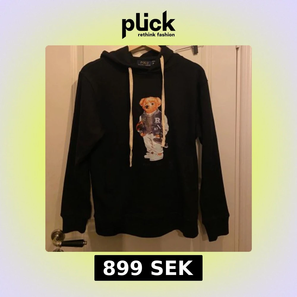 Säljer en svart hoodie från Polo Ralph Lauren med polo björnen på framsidan. Hoodien har långa ärmar och en justerbar huva med vita snören. Perfekt för en avslappnad stil.