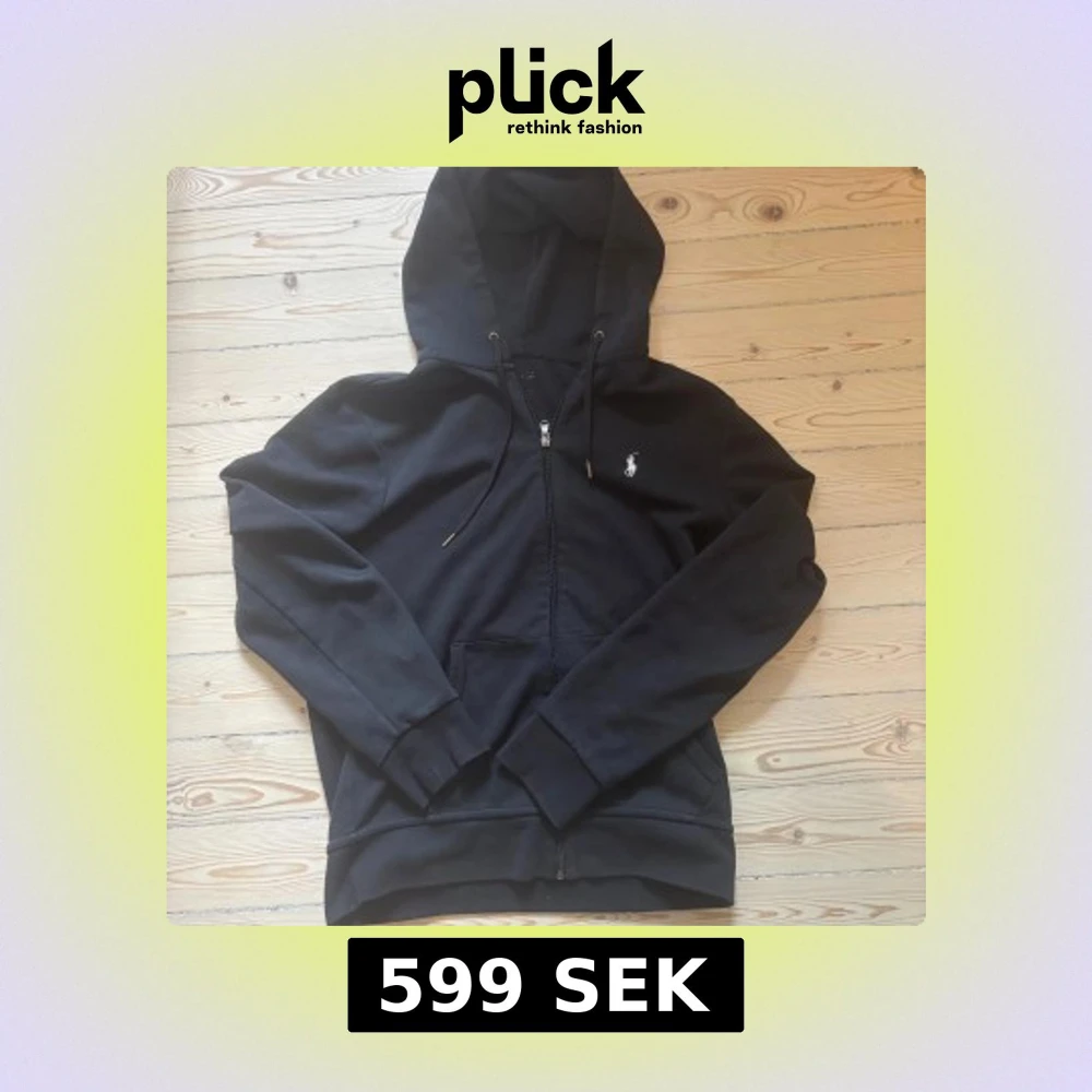 Svart hoodie från Ralph Lauren med dragkedja och huva. Klassisk design med vit broderad logga på bröstet och känguruficka framtill. Mjukt material och ribbade muddar vid ärmslut och nederkant. Perfekt för en avslappnad och stilren look. Skick 8,5/10 Inga defekter på hoodien
