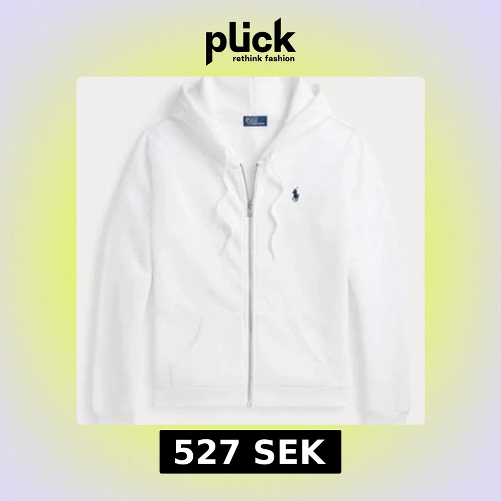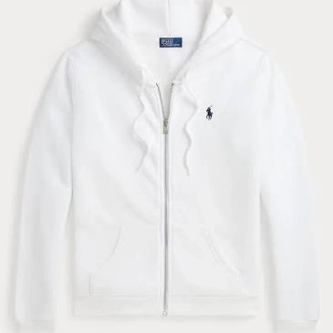 Vit hoodie från Polo Ralph Lauren med dragkedja framtill, huva med snörning och broderad blå logga på bröstet. Klassisk passform och mjukt material, perfekt för en chill look.