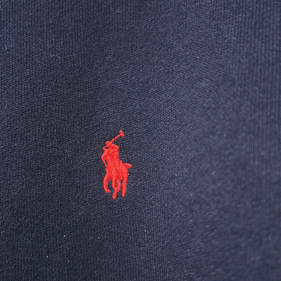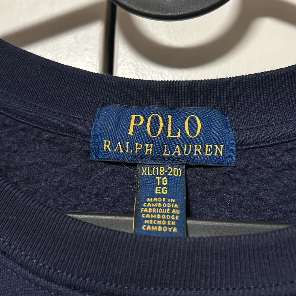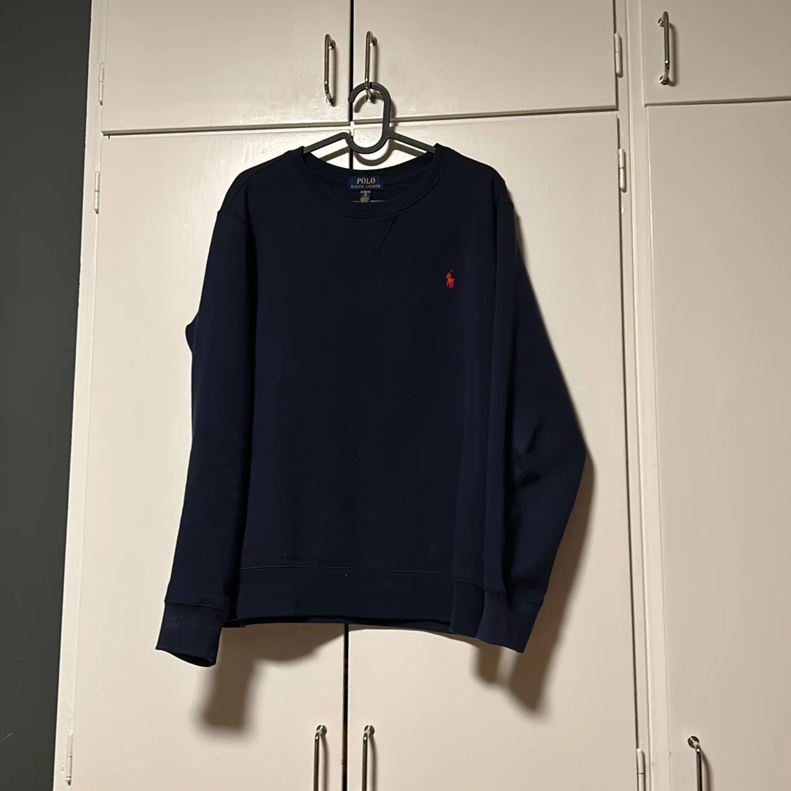 Säljer en stilren mörkblå tröja från Polo Ralph Lauren med det klassiska röda broderade logotypen på bröstet. Tröjan har långa ärmar och en bekväm passform. Perfekt för en avslappnad och snygg look. XL ungdom