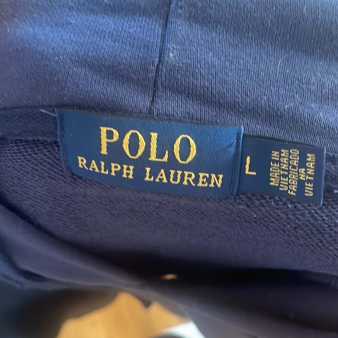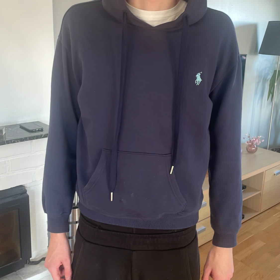 Säljer en marinblå hoodie från Polo Ralph Lauren med klassisk broderad logga på bröstet. Tröjan har huva med snörning, känguruficka och långa ärmar. Skön och stilren modell i mjuk bomullsblandning, perfekt för chill dagar. Den är dock väldigt liten i storleken den är typ XS/S