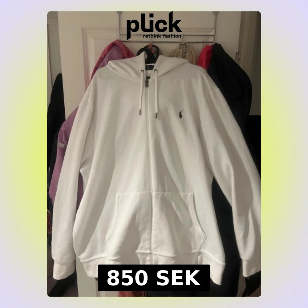 Vit hoodie från Polo Ralph Lauren i storlek XXL. Klassisk design med dragkedja, huva med snörning och två stora fickor framtill. Diskret Polo-logga broderad på bröstet. Perfekt för chill dagar och enkel att matcha med jeans eller joggers.