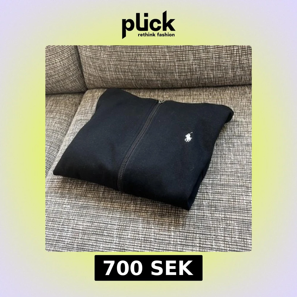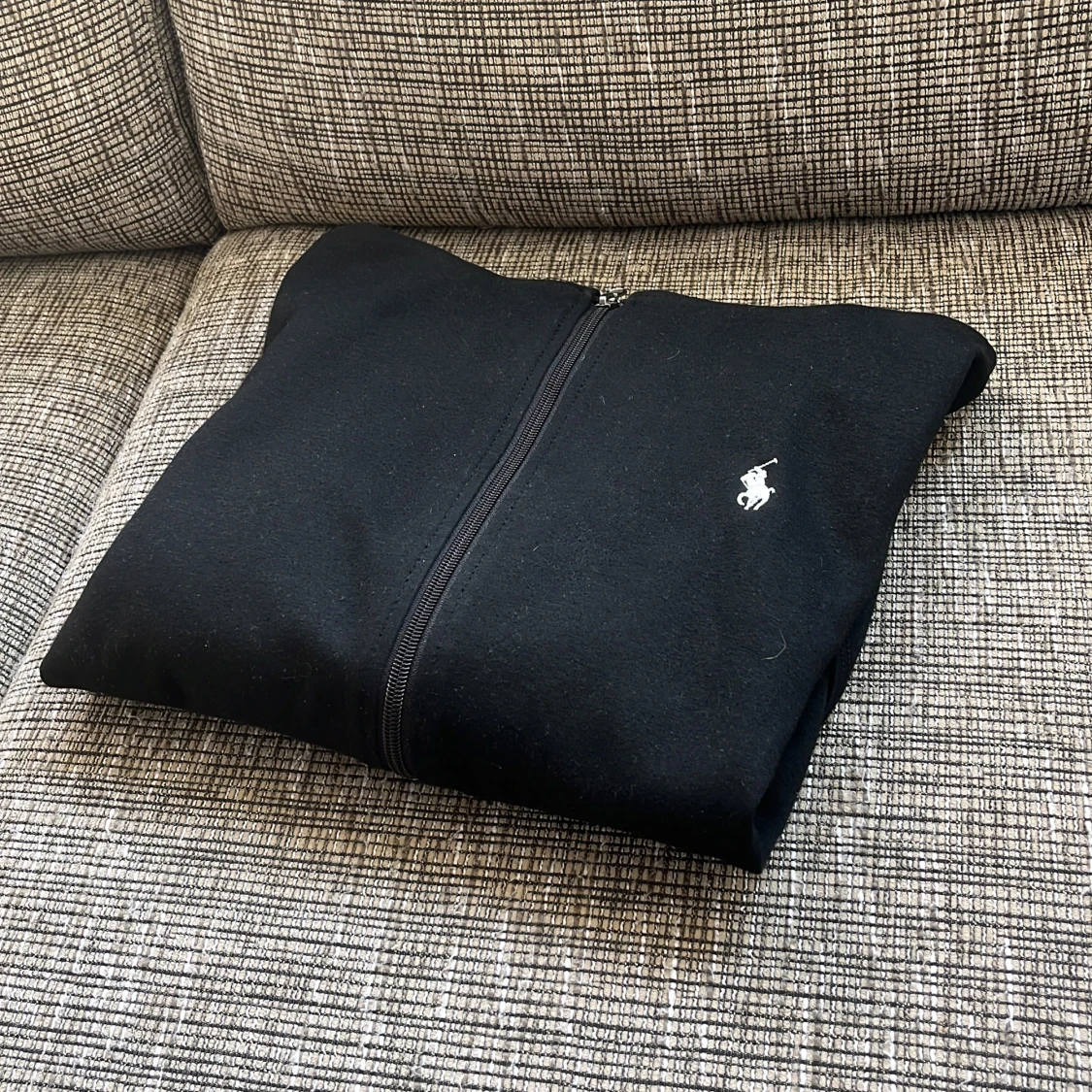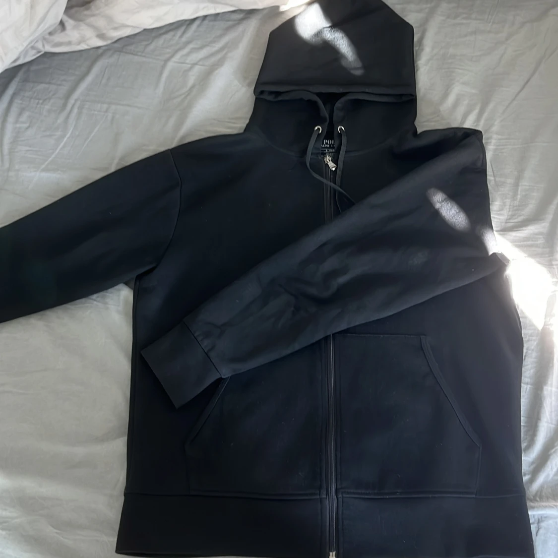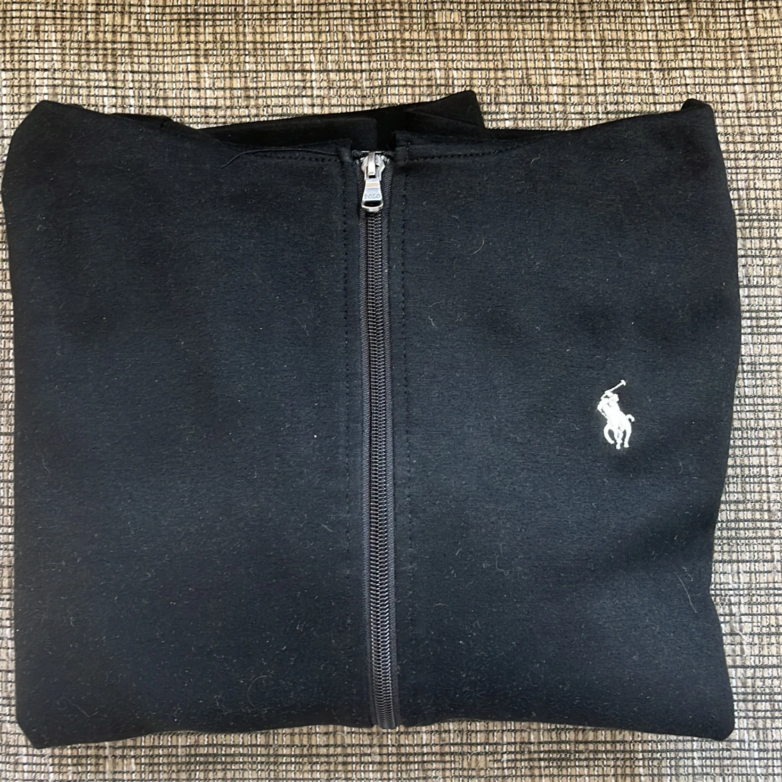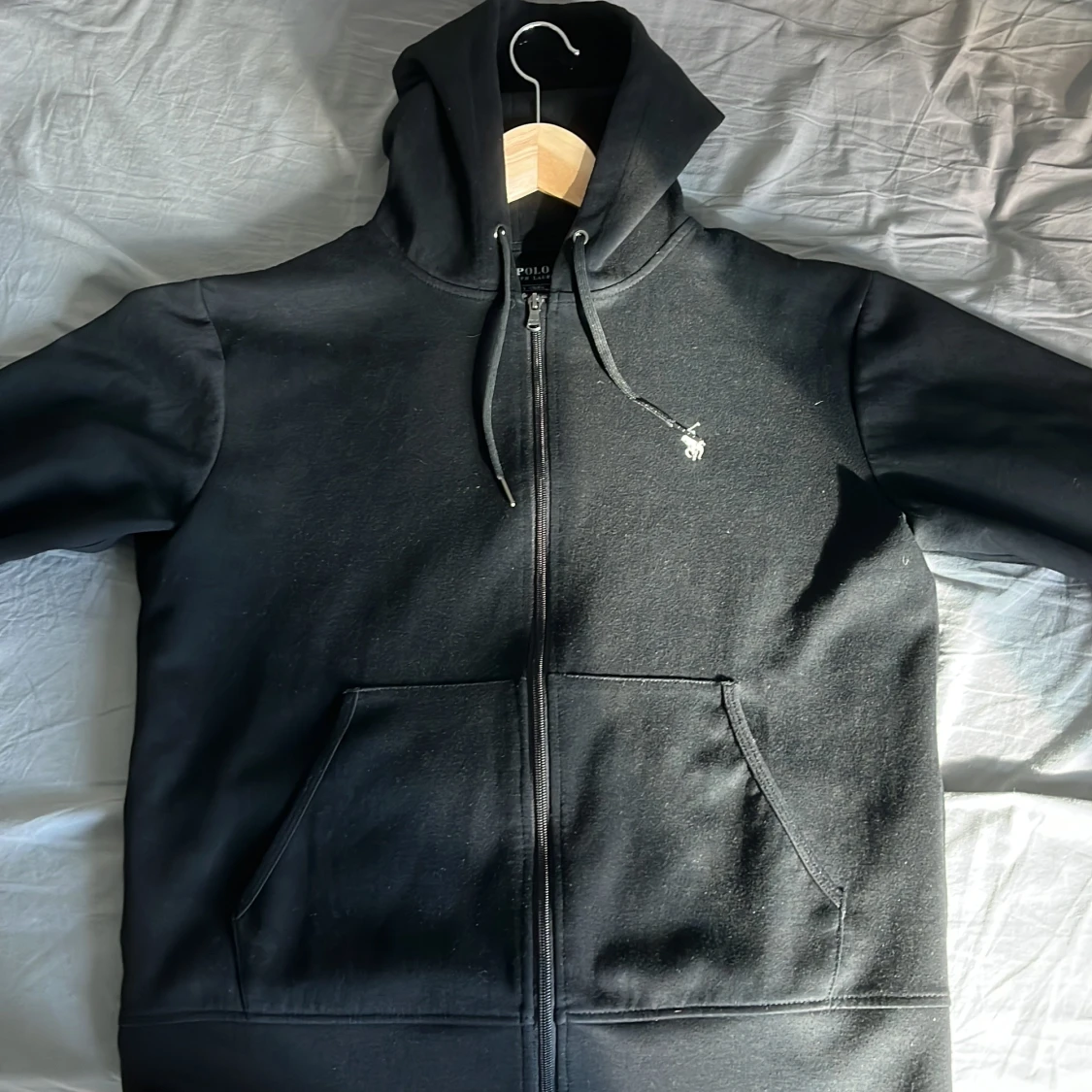 Säljer en svart Ralph lauren zip hoodie med vitt märke och snören kvar