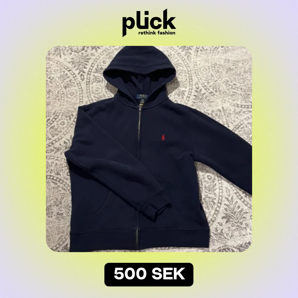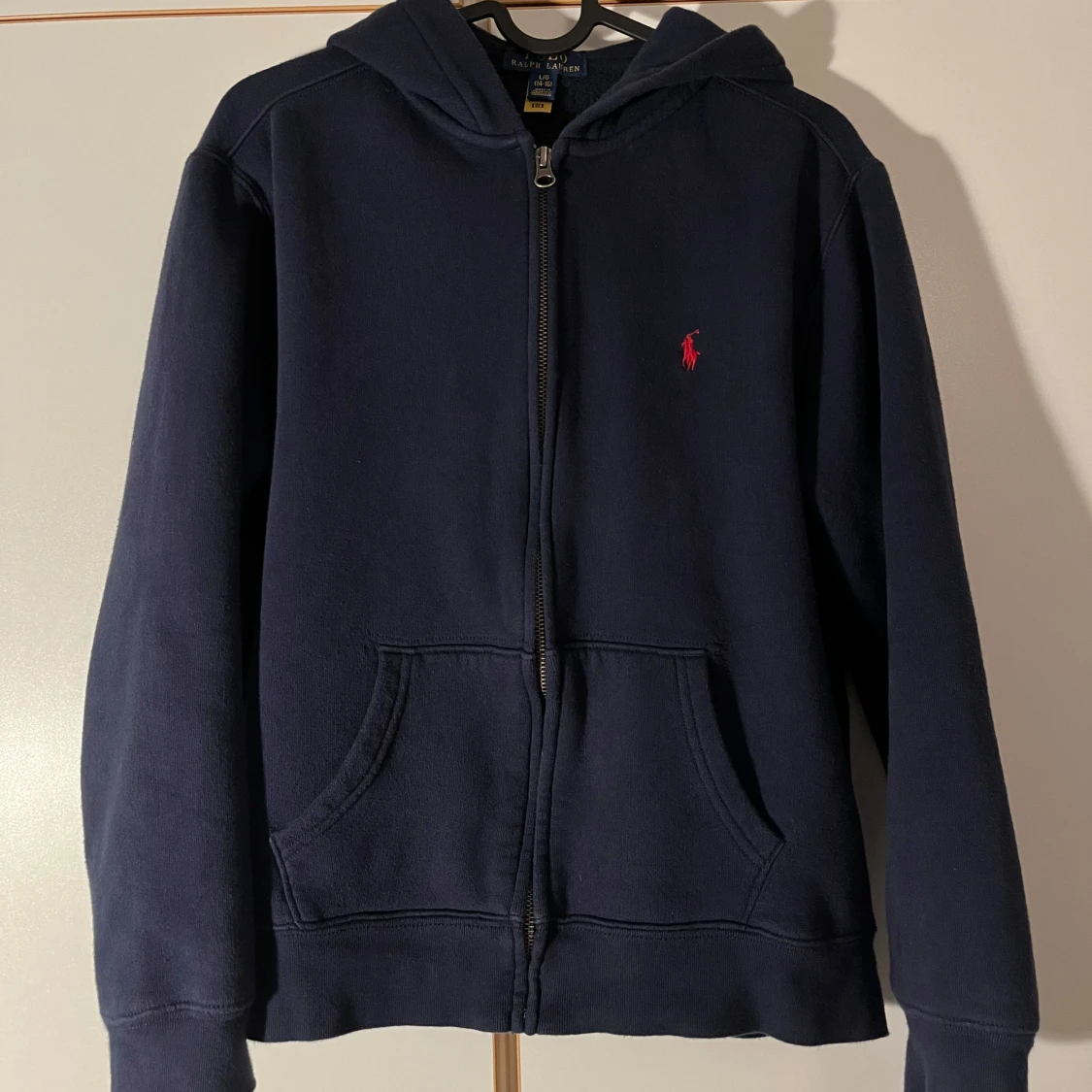 Säljer min blåa Polo Ralph Lauren zipup eftersom den börjar bli för liten. Den är i 7/10 skick. Nypris runt 1.200kr Storlek 14-16/160cm Inga skador förutom en liten bit tråd som syns i fjärde bilden.
