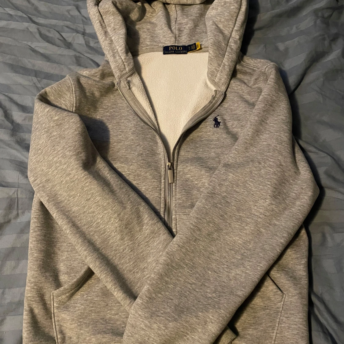 Säljer en grå hoodie från Polo Ralph Lauren med dragkedja och huva. Tröjan har lång ärm, fickor framtill och den klassiska broderade loggan på bröstet. Mjuk insida och stilren look som funkar till jeans eller joggers. Storlek M men skulle mer säga att den passar folk med stl S