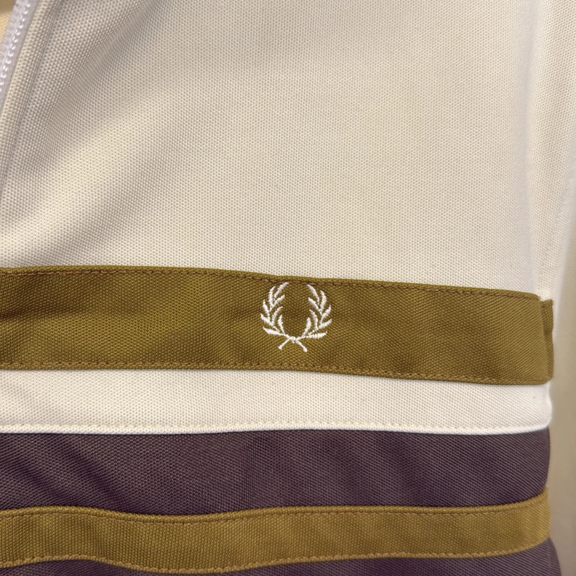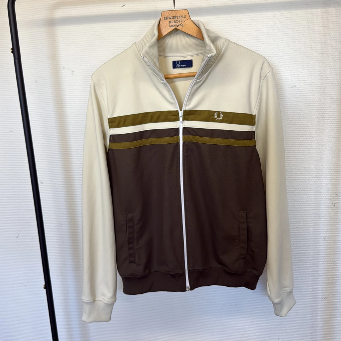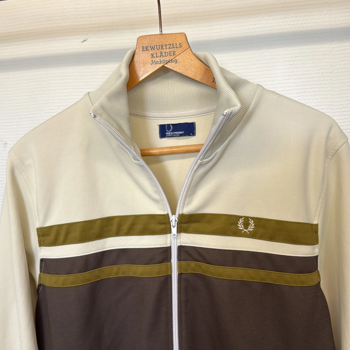 Snygg tracktop från Fred Perry i storlek L. Jackan har en cool färgblockad design med beige, bruna och olivgröna ränder, samt vit dragkedja och ribbad krage. Ikonisk Fred Perry-logga broderad på bröstet. Perfekt för dig som gillar sportig och retro stil.