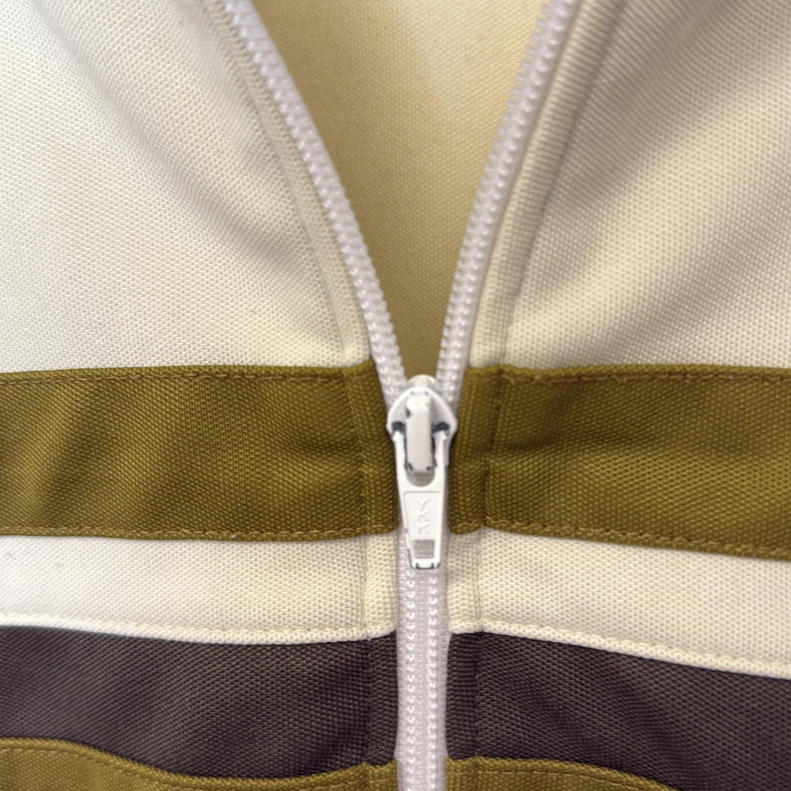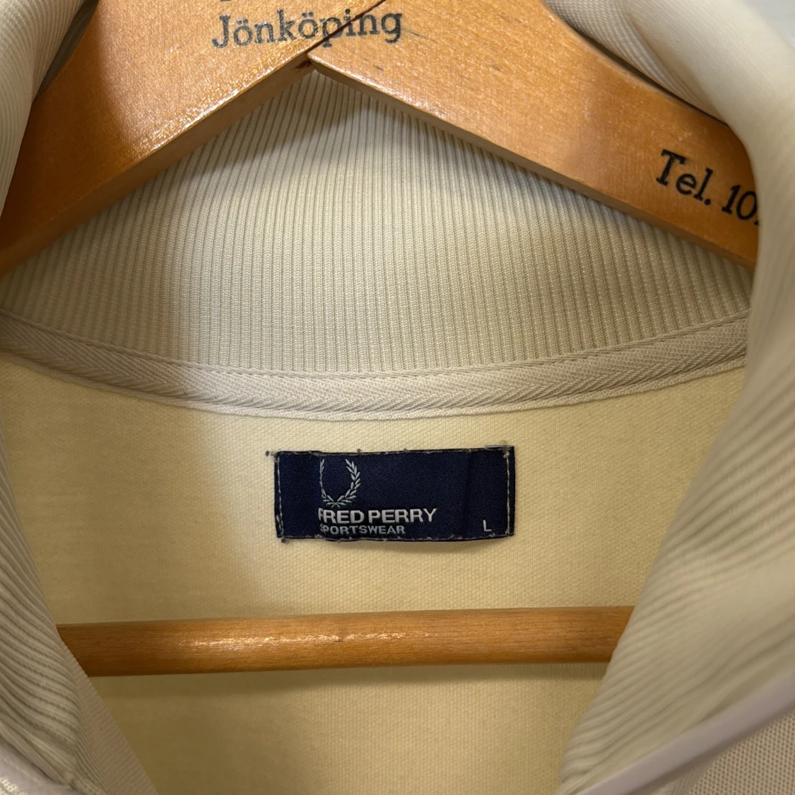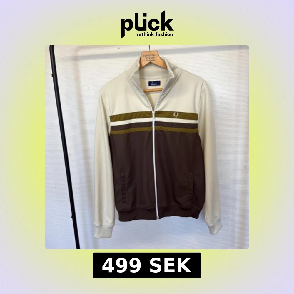 Snygg tracktop från Fred Perry i storlek L. Jackan har en cool färgblockad design med beige, bruna och olivgröna ränder, samt vit dragkedja och ribbad krage. Ikonisk Fred Perry-logga broderad på bröstet. Perfekt för dig som gillar sportig och retro stil.