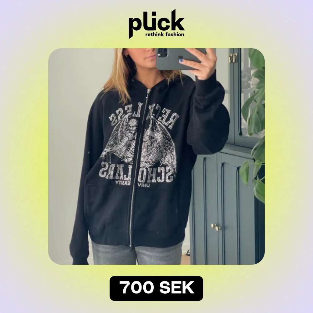 så cool zip up-tröja från RECKLESS SCHOLARS, storlek L men sitter perfekt oversized på S. slitningar/lossnade stenar på framsidan syns på tredje bilden, har även 3 mindre hål men är nog lätt att fixa. kan diskutera priset🖤