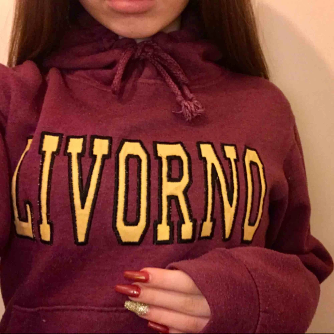 En röd/lila aktiv hoodie med luva. Vet ej vilket märke elr storlek men den passar på mig som har stl XS/S. Den är medium lång, räcker till höften och jag är 163 cm lång.