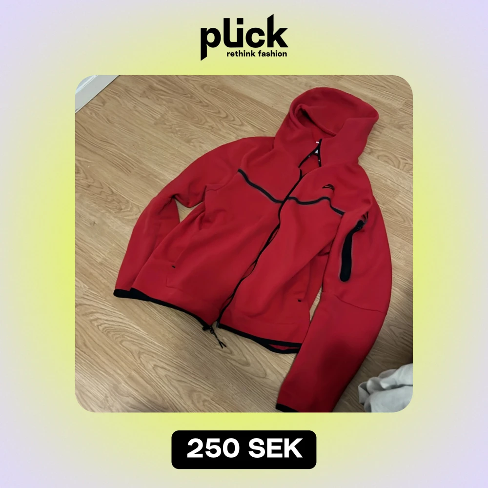 Säljer en röd fleece med huva och svarta detaljer. Jackan har dragkedja framtill och långa ärmar. Perfekt för kyligare dagar.