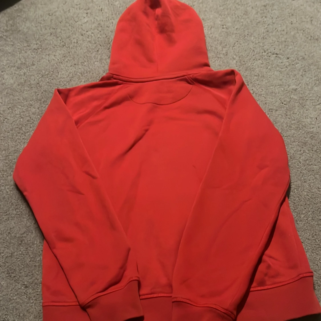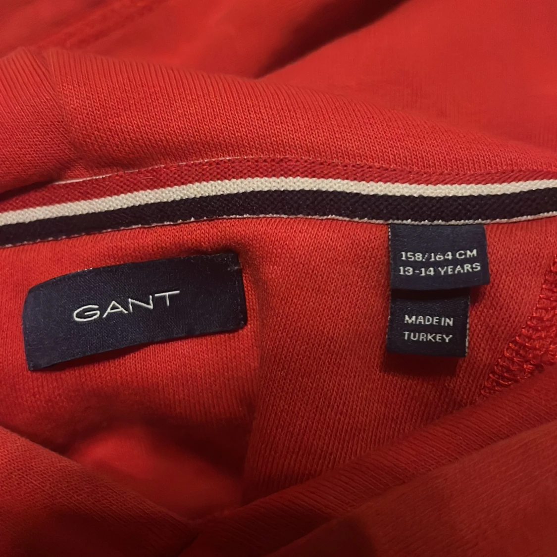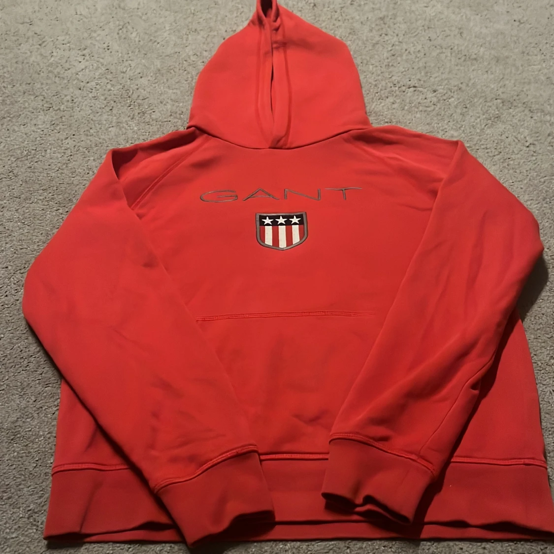 Säljer en snygg röd hoodie från GANT med ett tryckt emblem på framsidan. Tröjan har en klassisk känguruficka och en bekväm huva. Perfekt för en avslappnad stil.